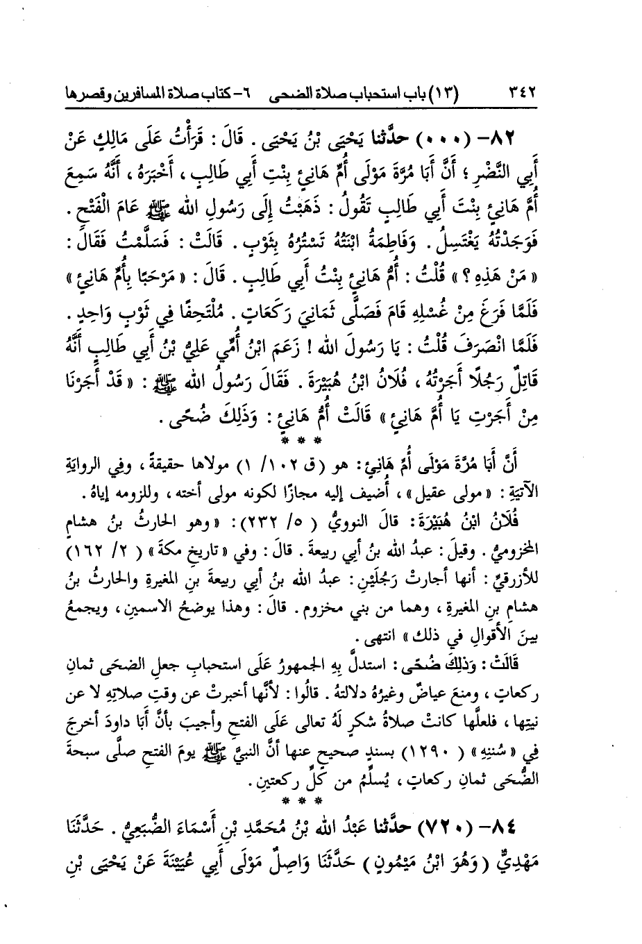 [336] أم هَانِئ بِهَمْزَة بعد النُّون كنيت بابنها هَانِئ وَاسْمهَا فَاخِتَة وَقيل هِنْد وحرصت بِفَتْح الرَّاء أشهر من كسرهَا أَن أَبَا مرّة مولى أم هَانِئ هُوَ مَوْلَاهَا حَقِيقَة وَفِي الرِّوَايَة الْآتِيَة مولى عقيل أضيف إِلَيْهِ مجَازًا لكَونه مولى أُخْته وللزومه إِيَّاه فلَان بن هُبَيْرَة قَالَ النَّوَوِيّ وَهُوَ الْحَارِث بن هِشَام المَخْزُومِي وَقيل عبد الله بن أبي ربيعَة قَالَ وَفِي تَارِيخ مَكَّة للأزرقي أَنَّهَا أجارت رجلَيْنِ عبد الله بن أبي ربيعَة بن الْمُغيرَة والْحَارث بن هِشَام بن الْمُغيرَة وهما من بني مَخْزُوم قَالَ وَهَذَا يُوضح الاسمين وَيجمع بَين الْأَقْوَال فِي ذَلِك انْتهى قَالَت وَذَلِكَ ضحى اسْتدلَّ بِهِ الْجُمْهُور على اسْتِحْبَاب جعل الضُّحَى ثَمَان رَكْعَات وَمنع عِيَاض وَغَيره دلَالَته قَالُوا لِأَنَّهَا أخْبرت عَن وَقت صلَاته لَا عَن نِيَّتهَا فلعلها كَانَت صَلَاة شكر لله تَعَالَى على الْفَتْح وَأجِيب بِأَن أَبَا دَاوُد أخرج فِي سنَنه بِسَنَد صَحِيح عَنْهَا أَن النَّبِي صلى الله عَلَيْهِ وَسلم يَوْم الْفَتْح صلى سبْحَة الضُّحَى ثَمَان رَكْعَات يسلم من كل رَكْعَتَيْنِ