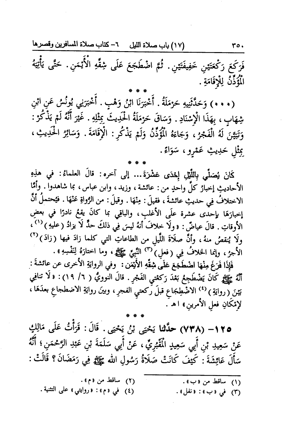 [736] كَانَ يُصَلِّي بِاللَّيْلِ إِحْدَى عشرَة إِلَى آخِره قَالَ الْعلمَاء فِي هَذِه الْأَحَادِيث إِخْبَار كل وَاحِد من عَائِشَة وَزيد وَابْن عَبَّاس بِمَا شاهدوا وَأما الِاخْتِلَاف فِي حَدِيث عَائِشَة فَقيل مِنْهَا وَقيل من الروَاة عَنْهَا فَيحْتَمل أَن إخبارها بِإِحْدَى عشرَة على الْأَغْلَب وَالْبَاقِي بِمَا كَانَ يَقع نَادرا فِي بعض الْأَوْقَات قَالَ عِيَاض وَلَا خلاف أَنه لَيْسَ فِي ذَلِك حد لَا يُزَاد عَلَيْهِ وَلَا ينقص مِنْهُ وَإِن صَلَاة اللَّيْل من الطَّاعَات الَّتِي كلما زَاد فِيهَا زَاد الْأجر وَإِنَّمَا الْخلاف فِي فعل النَّبِي صلى الله عَلَيْهِ وَسلم وَمَا اخْتَارَهُ لنَفسِهِ فَإِذا فرغ مِنْهَا اضْطجع على شقَّه الْأَيْمن وَفِي الرِّوَايَة الْأُخْرَى عَن عَائِشَة أَنه صلى الله عَلَيْهِ وَسلم كَانَ يضطجع بعد رَكْعَتي الْفجْر قَالَ النَّوَوِيّ لَا تنَافِي بَين رِوَايَة الِاضْطِجَاع قبل رَكْعَتي الْفجْر وَبَين رِوَايَة الِاضْطِجَاع بعْدهَا لِإِمْكَان فعل الْأَمريْنِ اه