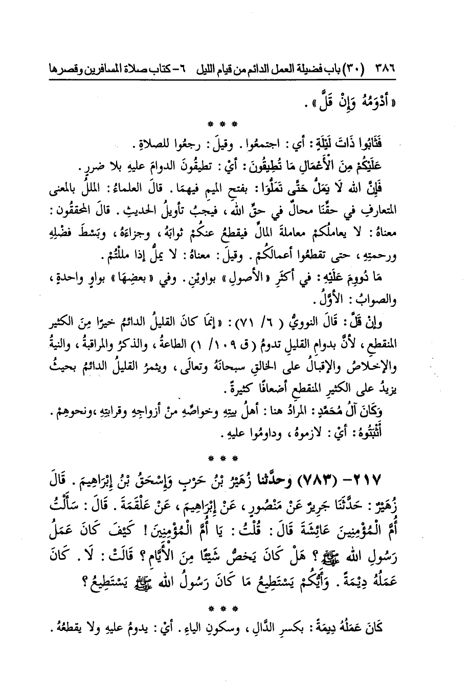 [782] فثابوا ذَات لَيْلَة أَي اجْتَمعُوا وَقيل رجعُوا للصَّلَاة عَلَيْكُم من الْأَعْمَال مَا تطيقون أَي تطيقون الدَّوَام عَلَيْهِ بِلَا ضَرَر فَإِن الله لَا يمل حَتَّى تملوا بِفَتْح الْمِيم فيهمَا قَالَ الْعلمَاء الْملَل بِالْمَعْنَى الْمُتَعَارف فِي حَقنا محَال فِي حق الله فَيجب تَأْوِيل الحَدِيث قَالَ الْمُحَقِّقُونَ مَعْنَاهُ لَا يعاملكم مُعَاملَة المَال فَيقطع عَنْكُم ثَوَابه وجزاءه وَبسط فَضله وَرَحمته حَتَّى تقطعوا أَعمالكُم وَقيل مَعْنَاهُ لَا يمل إِذا مللتم مَا دووم عَلَيْهِ فِي أَكثر الْأُصُول بواوين وَفِي بَعْضهَا بواو وَاحِدَة وَالصَّوَاب الأول وَإِن قل قَالَ النَّوَوِيّ إِنَّمَا كَانَ الْقَلِيل الدَّائِم خيرا من الْكثير الْمُنْقَطع لِأَن بدوام الْقَلِيل تدوم الطَّاعَة وَالذكر والمراقبة وَالنِّيَّة وَالْإِخْلَاص والإقبال على الْخَالِق سُبْحَانَهُ وَتَعَالَى ويثمر الْقَلِيل الدَّائِم بِحَيْثُ يزِيد على الْكثير الْمُنْقَطع أضعافا كَثِيرَة وَكَانَ آل مُحَمَّد المُرَاد هُنَا أهل بَيته وخواصه من أَزوَاجه وقرابته وَنَحْوهم أثبتوه أَي لازموه وداوموا عَلَيْهِ
