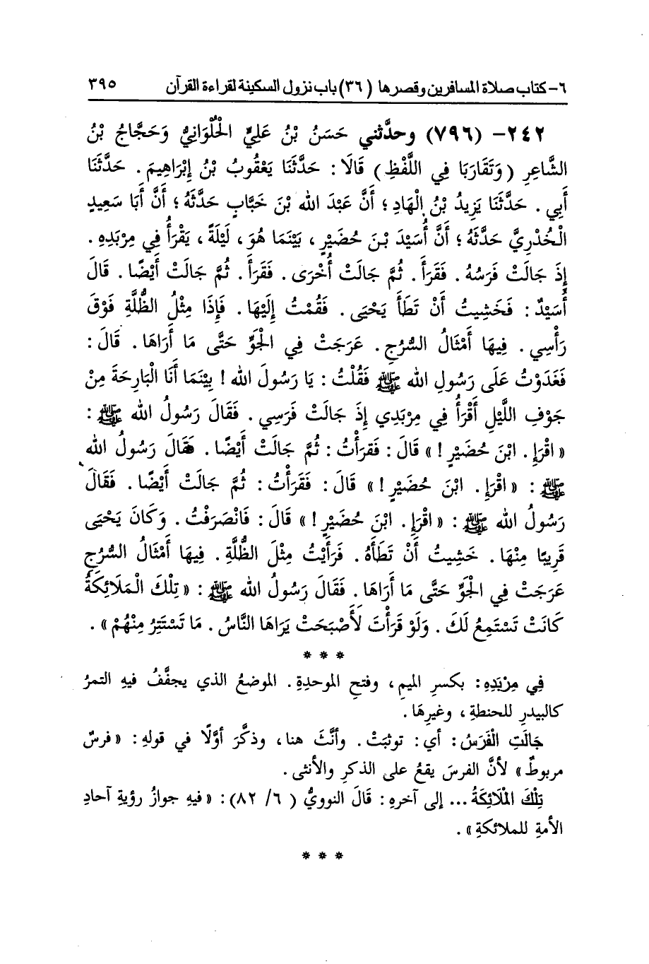 [795] بشطنين بِفَتْح الشين الْمُعْجَمَة والطاء تَثْنِيَة شطن وَهُوَ الْحَبل الطَّوِيل المضطرب وَجعل فرسه ينفر بِالْفَاءِ وَالرَّاء تِلْكَ السكينَة قَالَ النَّوَوِيّ قد قيل فِي معنى السكينَة هُنَا أَشْيَاء الْمُخْتَار مِنْهَا أَنَّهَا شَيْء من مخلوقات الله تَعَالَى فِيهِ طمأنينة وَرَحْمَة وَمَعَهُ الْمَلَائِكَة تنفر بِالْفَاءِ وَالرَّاء بِلَا خلاف اقْرَأ فلَان مَعْنَاهُ كَانَ يَنْبَغِي أَن تستمر على الْقِرَاءَة وتغتنم مَا حصل لَك من نزُول السكينَة وَالْمَلَائِكَة وتستكثر من الْقِرَاءَة الَّتِي هِيَ سَبَب بَقَائِهَا