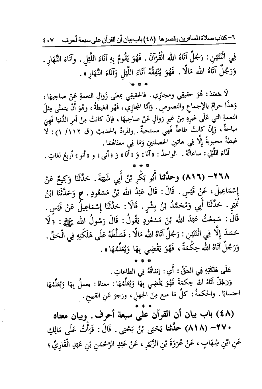 [815] لَا حسد هُوَ حَقِيقِيّ ومجازي فالحقيقي بِمَعْنى زَوَال النِّعْمَة عَن صَاحبهَا وَهَذَا حرَام بِالْإِجْمَاع والنصوص وَأما الْمجَازِي فَهُوَ الْغِبْطَة وَهُوَ أَن يتَمَنَّى مثل النِّعْمَة الَّتِي على غَيره من غير زَوَال عَن صَاحبهَا فَإِن كَانَت من أَمر الدُّنْيَا فَهِيَ مُبَاحَة وَإِن كَانَت طَاعَة فَهِيَ مُسْتَحبَّة وَالْمرَاد بِالْحَدِيثِ لَا غِبْطَة محبوبة إِلَّا فِي هَاتين الخصلتين وَمَا فِي مَعْنَاهُمَا آنَاء اللَّيْل ساعاته الْوَاحِد آنا وَأَنا وأنى وأنو أَربع لُغَات