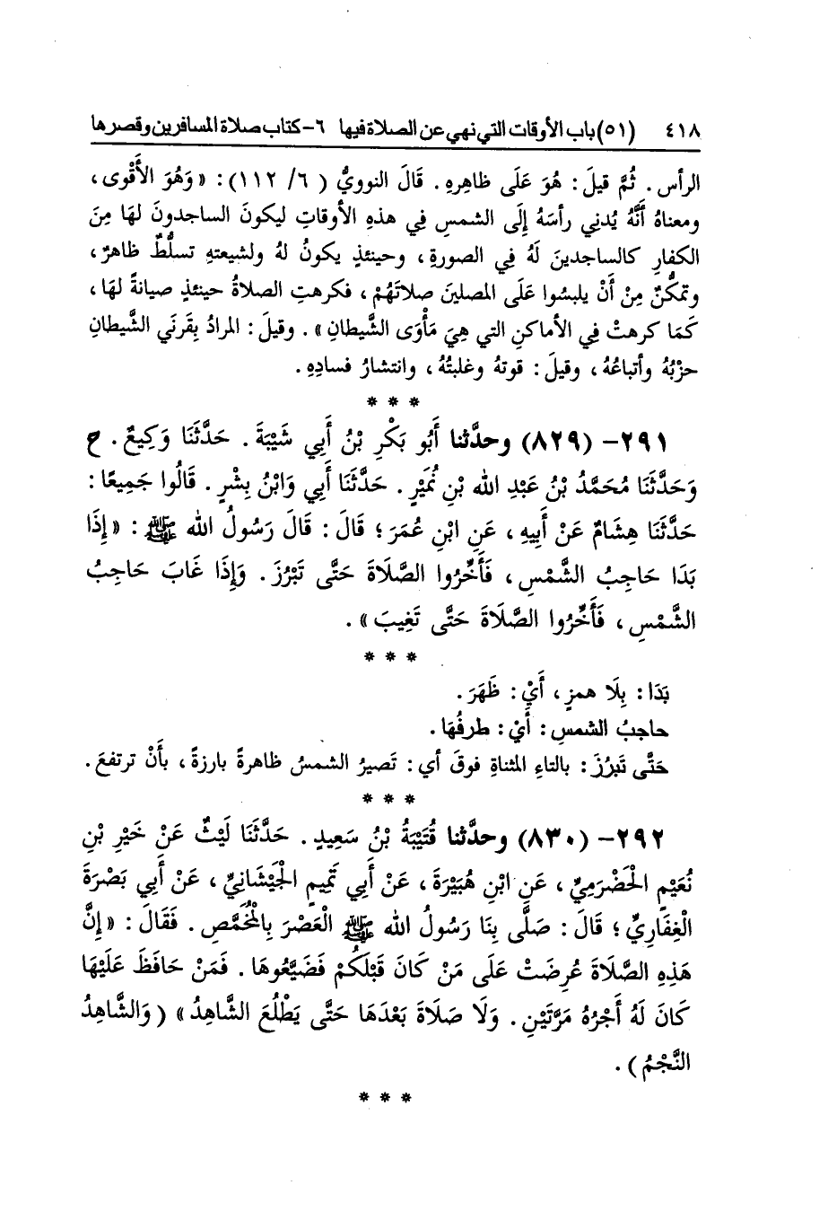 [829] بدا بِلَا همز أَي ظهر حَاجِب الشَّمْس أَي طرفها حَتَّى تبرز بِالتَّاءِ الْمُثَنَّاة فَوق أَي تصير الشَّمْس ظَاهِرَة بارزة بِأَن ترْتَفع