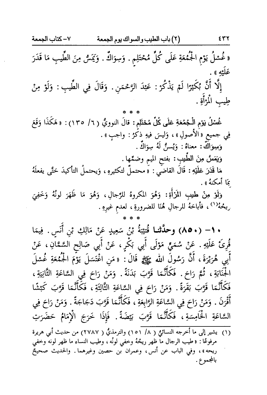 [846] غسل يَوْم الْجُمُعَة على كل محتلم قَالَ النَّوَوِيّ هَكَذَا وَقع فِي جَمِيع الْأُصُول وَلَيْسَ فِيهِ ذكر وَاجِب وَسوَاك مَعْنَاهُ وَيسن لَهُ سواك ويمس من الطّيب بِفَتْح الْمِيم وَضمّهَا مَا قدر عَلَيْهِ قَالَ القَاضِي مُحْتَمل لتكثيره وَيحْتَمل التَّأْكِيد حَتَّى يَفْعَله بِمَا أمكنه وَلَو من طيب الْمَرْأَة وَهُوَ الْمَكْرُوه للرِّجَال وَهُوَ مَا ظهر لَونه وخفي رِيحه فأباحه للرِّجَال هُنَا للضَّرُورَة لعدم غَيره