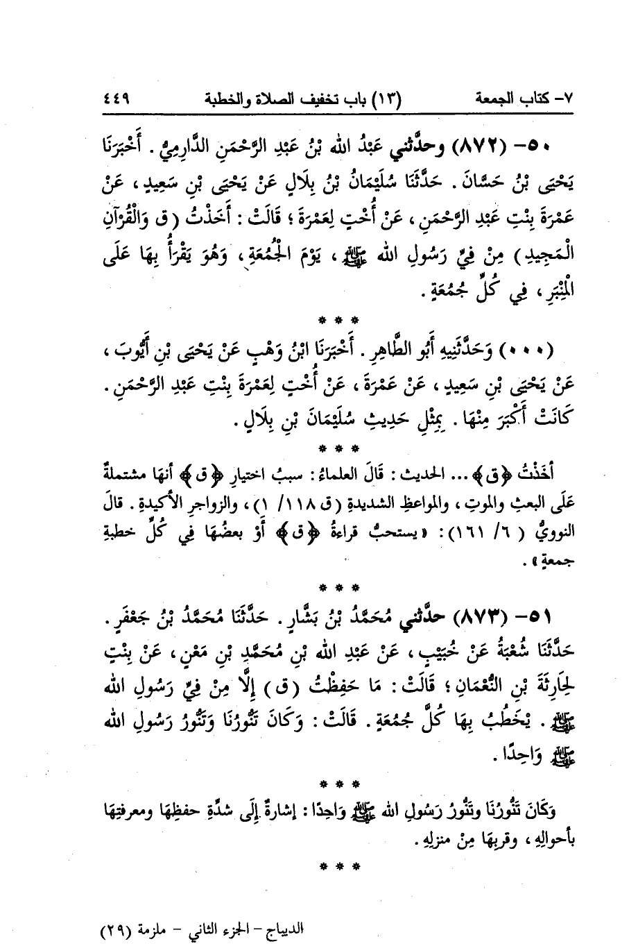 [872] أخذت ق الحَدِيث قَالَ الْعلمَاء سَبَب اخْتِيَار ق أَنَّهَا مُشْتَمِلَة على الْبَعْث وَالْمَوْت والمواعظ الشَّدِيدَة والزواجر الأكيدة قَالَ النَّوَوِيّ يسْتَحبّ قِرَاءَة ق أَو بَعْضهَا فِي كل خطْبَة جُمُعَة