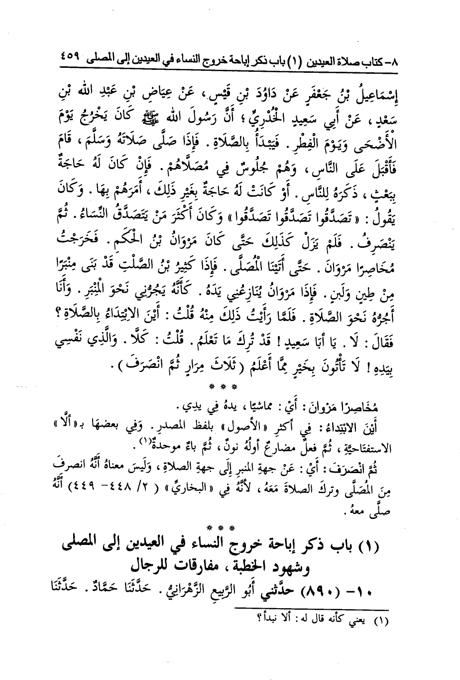 [889] مخاصرا مَرْوَان أَي مماشيا يَده فِي يَده أَيْن الإبتداء فِي أَكثر الْأُصُول بِلَفْظ الْمصدر وَفِي بَعْضهَا بألا الاستفتاحية ثمَّ فعل مضارع أَوله نون ثمَّ بَاء مُوَحدَة ثمَّ انْصَرف أَي عَن جِهَة الْمِنْبَر إِلَى جِهَة الصَّلَاة وَلَيْسَ مَعْنَاهُ أَنه انْصَرف من الْمصلى وَترك الصَّلَاة مَعَه لِأَنَّهُ فِي البُخَارِيّ أَنه صلى مَعَه