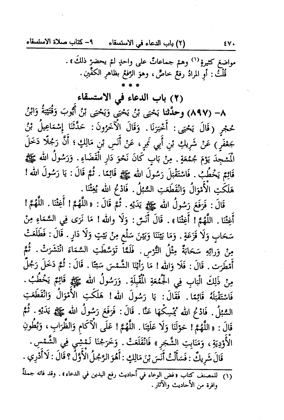 [895] كَانَ لَا يرفع يَدَيْهِ فِي شَيْء من دُعَائِهِ إِلَّا فِي الاسْتِسْقَاء قَالَ النَّوَوِيّ ظَاهره يُوهم أَنه صلى الله عَلَيْهِ وَسلم لم يرفع إِلَّا فِي الاسْتِسْقَاء وَلَيْسَ كَذَلِك فقد ثَبت رفع يَدَيْهِ فِي الدُّعَاء فِي مَوَاطِن غير الاسْتِسْقَاء وَهِي أَكثر من أَن تحصر فيتأول هَذَا الحَدِيث على أَنه لم يرفع الرّفْع البليغ بِحَيْثُ يرى بَيَاض إبطَيْهِ إِلَّا فِي الاسْتِسْقَاء أَو المُرَاد لم أره يرفع وَقد رَآهُ غَيره يرفع فَيقدم المثبتون فِي مَوَاضِع كَثِيرَة وهم جماعات على وَاحِد لم يحضر ذَلِك قلت أَو المُرَاد رفع خَاص وَهُوَ الرّفْع بِظَاهِر الْكَفَّيْنِ