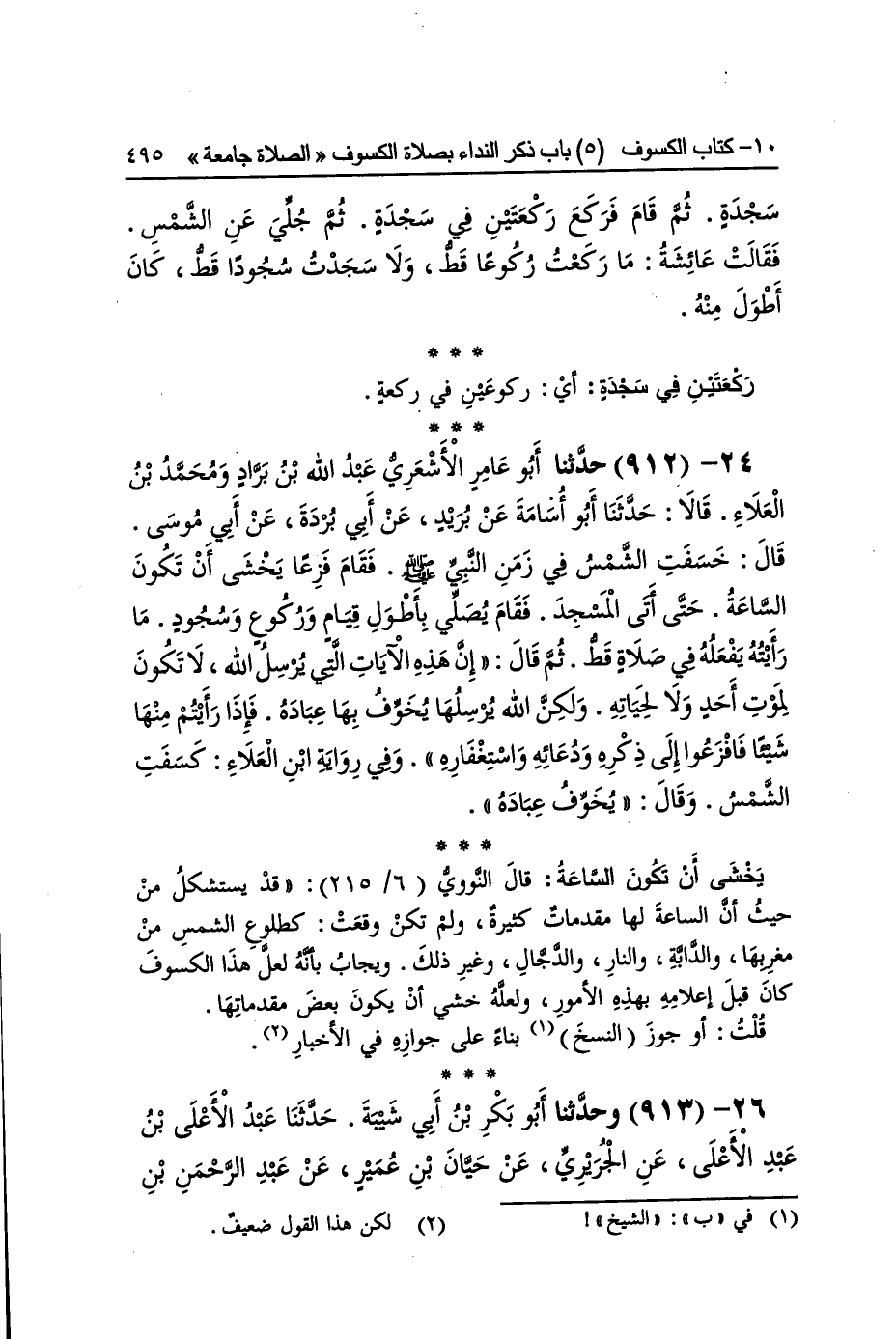 [912] يخْشَى أَن تكون السَّاعَة قَالَ النَّوَوِيّ قد يسْتَشْكل من حَيْثُ أَن السَّاعَة لَهَا مُقَدمَات كَثِيرَة وَلم تكن وَقعت كطلوع الشَّمْس من مغْرِبهَا وَالدَّابَّة وَالنَّار والدجال وَغير ذَلِك وَيُجَاب بِأَنَّهُ لَعَلَّ هَذَا الْكُسُوف كَانَ قبل إِعْلَامه بِهَذِهِ الْأُمُور وَلَعَلَّه خشِي أَن يكون بعض مقدماتها قلت أَو جوز النّسخ بِنَاء على جَوَازه فِي الْإِخْبَار