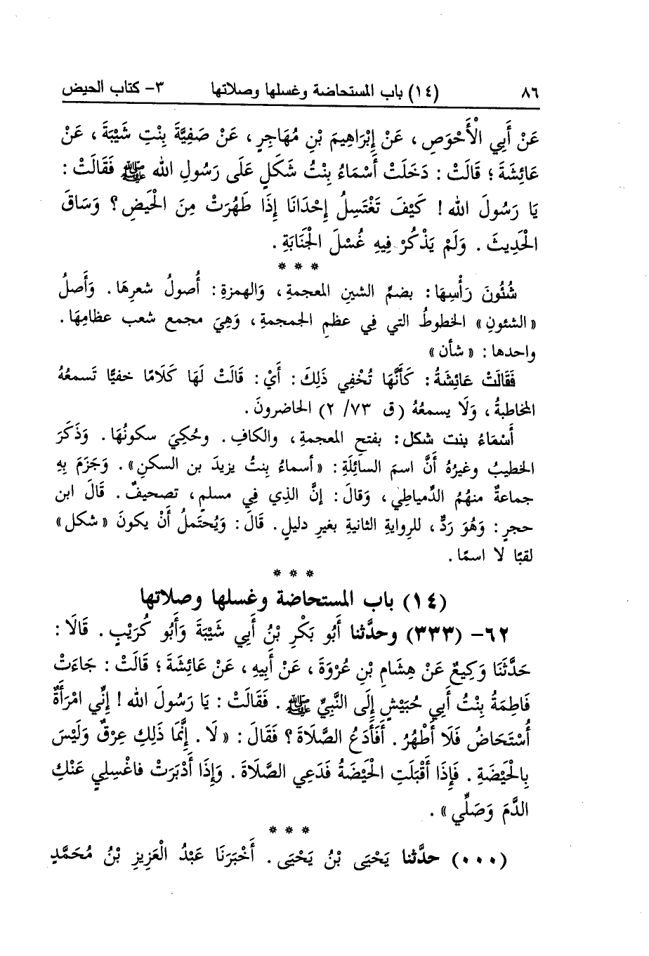 [332] فرْصَة بِكَسْر الْفَاء وَسُكُون الرَّاء وإهمال الصَّاد قِطْعَة مسك بِكَسْر الْمِيم الطّيب الْمَعْرُوف وَقيل بِفَتْحِهَا الْجلد ممسكة بِضَم الْمِيم الأولى وَفتح الثَّانِيَة أَي قِطْعَة قطن أَو خرقَة مطيبة بالمسك شؤون رَأسهَا بِضَم الشين الْمُعْجَمَة والهمزة أصُول شعرهَا وأصل الشئون الخطوط الَّتِي فِي عظم الجمجمة وَهِي مجمع شعب عظامها وَاحِدهَا شَأْن فَقَالَت عَائِشَة كَأَنَّهَا تخفي ذَلِك أَي قَالَت لَهَا كلَاما خفِيا تسمعه المخاطبة وَلَا يسمعهُ الْحَاضِرُونَ أَسمَاء بنت شكل بِفَتْح الْمُعْجَمَة وَالْكَاف وَحكي سكونها وَذكر الْخَطِيب وَغَيره أَن اسْم السائلة أَسمَاء بنت يزِيد بن السكن وَجزم بِهِ جمَاعَة مِنْهُم الدمياطي وَقَالَ إِن الَّذِي فِي مُسلم تَصْحِيف قَالَ بن حجر وَهُوَ رد للرواية الثَّانِيَة بِغَيْر دَلِيل قَالَ وَيحْتَمل أَن يكون شكل لقبا لَا اسْما