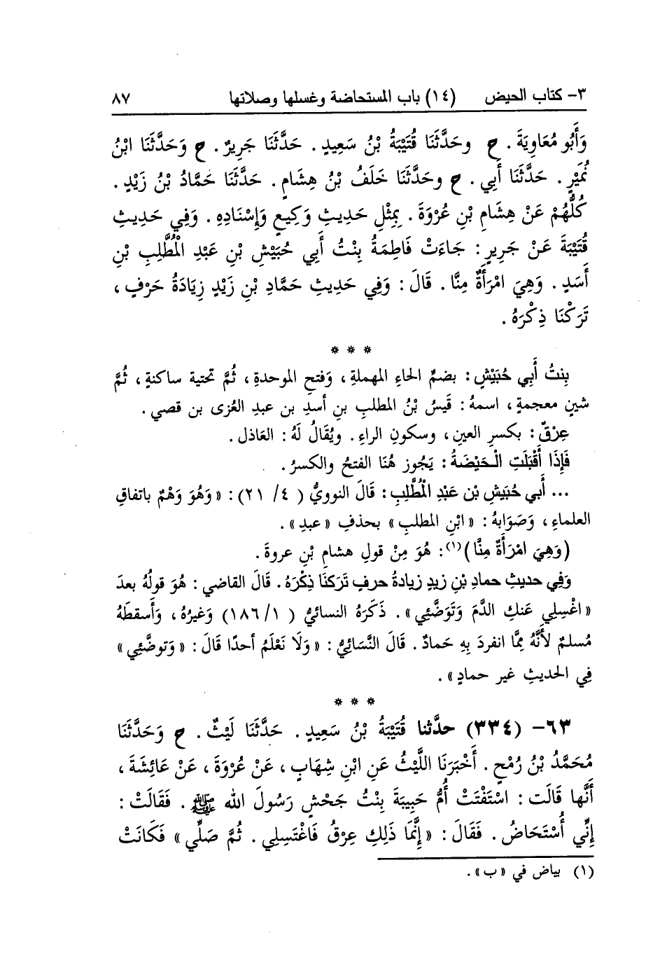 [333] بنت أبي حُبَيْش بِضَم الْحَاء الْمُهْملَة وَفتح الْمُوَحدَة ثمَّ تحتية سَاكِنة ثمَّ شين مُعْجمَة اسْمه قيس بن عبد الْمطلب بن أَسد بن عبد الْعُزَّى بن قصي عرق بِكَسْر الْعين وَسُكُون الرَّاء وَيُقَال لَهُ العاذل فَإِذا أَقبلت الْحَيْضَة يجوز هُنَا الْفَتْح وَالْكَسْر أبي حُبَيْش بن عبد الْمطلب قَالَ النَّوَوِيّ وَهُوَ وهم بإتفاق الْعلمَاء وَصَوَابه بن الْمطلب بِحَذْف عبد وَهِي امْرَأَة منا هُوَ من قَول هِشَام بن عُرْوَة وَفِي حَدِيث حَمَّاد بن زيد زِيَادَة حرف تركنَا ذكره قَالَ القَاضِي هُوَ قَوْله بعد اغسلي عَنْك الدَّم وتوضئي ذكره النَّسَائِيّ وَغَيره وأسقطه مُسلم لِأَنَّهُ مِمَّا انْفَرد بِهِ حَمَّاد قَالَ النَّسَائِيّ وَلَا نعلم أحدا قَالَ وتوضئي فِي الحَدِيث غير حَمَّاد