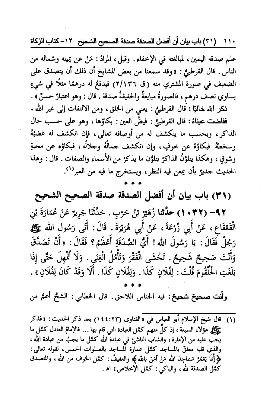 [1031] فِي ظله أَي ظلّ عَرْشه كَمَا صرح بِهِ فِي رِوَايَة أُخْرَى يَوْم لَا ظلّ إِلَّا ظله قَالَ النَّوَوِيّ المُرَاد يَوْم الْقِيَامَة إِذا قَامَ النَّاس لرب الْعَالمين وَقربت الشَّمْس من الرُّءُوس وَاشْتَدَّ عَلَيْهِم حرهَا وَأَخذهم الْعرق وَلَا ظلّ هُنَاكَ لشَيْء إِلَّا الْعَرْش وَقد يُرَاد بِهِ ظلّ الْجنَّة وَهُوَ نعيمها والكون فِيهَا كَمَا قَالَ الله تَعَالَى وندخلهم ظلا ظليلا قَالَ القَاضِي وَقَالَ بن دِينَار المُرَاد بالظل هُنَا الْكَرَامَة والكنف والأمن من المكاره فِي ذَلِك الْوَقْت وَلَيْسَ المُرَاد ظلّ الشَّمْس وَمَا قَالَه مَعْلُوم فِي اللِّسَان يُقَال فلَان فِي ظلّ فلَان أَي فِي كنفه وحمايته وَهَذَا أولى الْأَقْوَال وَتَكون إِضَافَته إِلَى الْعَرْش لِأَنَّهُ مَكَان التَّقْرِيب والكرامة وَإِلَّا فالشمس وَسَائِر الْعَالم تَحت الْعَرْش وَفِي ظله الإِمَام الْعَادِل قَالُوا هُوَ كل من إِلَيْهِ نظر فِي شَيْء من أُمُور الْمُسلمين وَبَدَأَ بِهِ لِكَثْرَة حفاظه وَعُمُوم نَفعه وشاب نَشأ بِعبَادة الله كَذَا فِي الْأُصُول بِالْبَاء وَهِي للمصاحبة أَي نَشأ متلبسا بهَا مصاحبا لَهَا قَالَه النَّوَوِيّ قَالَ الْقُرْطُبِيّ وَيحْتَمل أَن يكون بِمَعْنى فِي كَمَا فِي غير مُسلم نَشأ فِي عبَادَة الله كَمَا وَردت فِي بِمَعْنى الب فِي قَوْله يَأْتِيهم الله فِي ظلل قَالَ وَنَشَأ ثَبت وابتدأ أَي لم تكن لَهُ صبوة قلبه مُعَلّق كَذَا فِي أَكثر الْأُصُول وَفِي بَعْضهَا مُتَعَلق بِالتَّاءِ فِي الْمَسَاجِد فِي غير هَذِه الرِّوَايَة بالمساجد أَي شَدِيد الْحبّ لَهَا والملازمة للْجَمَاعَة فِيهَا وَلَيْسَ مَعْنَاهُ دوَام الْقعُود فِيهَا اجْتمعَا عَلَيْهِ وتفرقا عَلَيْهِ مَعْنَاهُ اجْتمعَا على حب الله وافترقا على حب الله أَي كَانَ سَبَب اجْتِمَاعهمَا حب الله واستمرا على ذَلِك حَتَّى تفَرقا من مجلسهما وهما صادقان فِي حب كل وَاحِد مِنْهُمَا صَاحبه لله تَعَالَى حَال اجْتِمَاعهمَا وافتراقهما دَعَتْهُ امْرَأَة أَي عرضت نَفسهَا عَلَيْهِ للزنى بهَا وَقيل النِّكَاح فخاف الْعَجز عَن الْقيام بِحَقِّهَا لِأَن الْخَوْف من الله شغله عَن لذات الدُّنْيَا وشهواتها ذَات منصب أَي نسب وَحسب وَشرف فَقَالَ إِنِّي أَخَاف الله قَالَ القَاضِي يحْتَمل قَول ذَلِك بِلِسَانِهِ وَيحْتَمل قَوْله فِي قلبه ليزجر نَفسه لَا تعلم يَمِينه مَا تنْفق شِمَاله كَذَا وَقع فِي جَمِيع رِوَايَات مُسلم وَالْمَعْرُوف فِي غَيره لَا تعلم شِمَاله مَا تنْفق يَمِينه وَهُوَ وَجه الْكَلَام لِأَن الْمَعْرُوف فِي النَّفَقَة أَن محلهَا الْيَمين قَالَ القَاضِي وَيُشبه أَن يكون الْوَهم فِيهَا من النَّاقِل عَن مُسلم لَا من مُسلم بِدَلِيل إِدْخَاله بعده حَدِيث مَالك وَقَالَ بِمثل حَدِيث عبيد وَبَين الْخلاف فِيهِ فِي قَوْله وَقَالَ رجل مُعَلّق بِالْمَسْجِدِ إِذا خرج مِنْهُ حَتَّى يعود فَلَو كَانَ مَا رَوَاهُ مُخَالفا لرِوَايَة مَالك لنبه عَلَيْهِ كَمَا نبه على هَذَا قَالَ الْعلمَاء وَهَذَا فِي صَدَقَة التَّطَوُّع أما الزَّكَاة الْوَاجِبَة فإعلانها أفضل وَضرب الْمثل بِالْيَمِينِ وَالشمَال لقربهما وملازمتهما وَالْمعْنَى لَو قدرت الشمَال رجلا متيقظا لما علم صدقه الْيَمين لمبالغته فِي الْإخْفَاء وَقيل المُرَاد من عَن يَمِينه وشماله من النَّاس قَالَ الْقُرْطُبِيّ وَقد سمعنَا من بعض الْمَشَايِخ أَن ذَلِك أَن يتَصَدَّق على الضَّعِيف فِي صُورَة المُشْتَرِي مِنْهُ فَيدْفَع لَهُ درهما مثلا فِي شَيْء يُسَاوِي نصف دِرْهَم فالصورة مبايعة والحقيقة صَدَقَة قَالَ وَهُوَ اعْتِبَار حسن ذكر الله خَالِيا قَالَ الْقُرْطُبِيّ يَعْنِي من الْخلق وَمن الِالْتِفَات إِلَى غير الله فَفَاضَتْ عَيناهُ قَالَ الْقُرْطُبِيّ فيض الْعين بكاؤها وَهُوَ على حسب حَال الذاكر وبحسب مَا ينْكَشف لَهُ من أَوْصَا