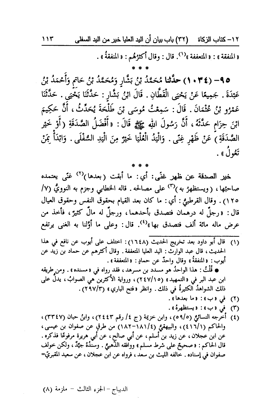[1033] يذكر الصَّدَقَة وَالتَّعَفُّف عَن الْمَسْأَلَة أَي يحض الْغَنِيّ عَن الصَّدَقَة وَالْفَقِير على التعفف وَالْيَد الْعليا المنفقة والسفلى السائلة قَالَ الْقُرْطُبِيّ هَذَا نَص يدْفع تعسف من تعسف فِي تَأْوِيله غير أَنه وَقع فِي بعض طرقه عِنْد أبي دَاوُد بدل المنفقة المتعففة قَالَ وَقَالَ أَكْثَرهم المنفقة