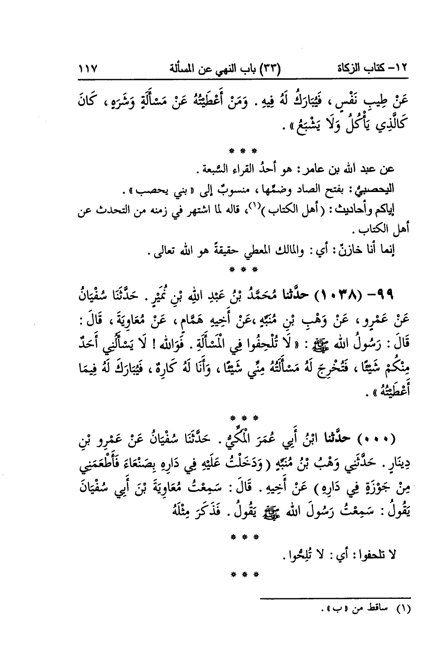 [1037] عَن عبد الله بن عَامر هُوَ أحد الْقُرَّاء السَّبْعَة الْيحصبِي بِفَتْح الصَّاد وَضمّهَا مَنْسُوب إِلَى بني يحصب إيَّاكُمْ وَأَحَادِيث أهل الْكتاب قَالَه لما اشْتهر فِي زَمَنه من التحدث عَن أهل الْكتاب إِنَّمَا أَنا خَازِن أَي وَالْمَالِك الْمُعْطِي حَقِيقَة هُوَ الله تَعَالَى