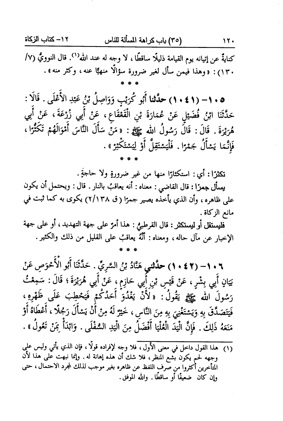 [1041] تكثرا أَي استكثارا مِنْهَا من غير ضَرُورَة وَلَا حَاجَة يسْأَل جمرا قَالَ القَاضِي مَعْنَاهُ أَنه يُعَاقب بالنَّار قَالَ وَيحْتَمل أَن يكون على ظَاهره وَأَن الَّذِي يَأْخُذهُ يصير جمرا يكوى بِهِ كَمَا ثَبت فِي مَانع الزَّكَاة فليستقل أَو ليستكثر قَالَ الْقُرْطُبِيّ هَذَا أَمر على وجهة التهديد أَو على وجهة الْإِخْبَار عَن مآل حَاله وَمَعْنَاهُ أَنه يُعَاقب على الْقَلِيل من ذَلِك وَالْكثير