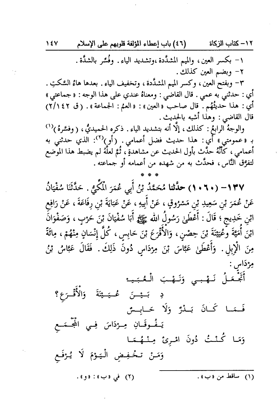 [1059] أَثَرَة بِفَتْح الْهمزَة والمثلثة فِي الْأَفْصَح وَهِي رِوَايَة العذري وبضم الْهمزَة وَإِسْكَان الثَّاء وَهِي رِوَايَة أبي بَحر وَهِي الاستئثار بالمشترك أَي يستأثر عَلَيْكُم ويفضل عَلَيْكُم غَيْركُمْ بِغَيْر حق إِن بن أُخْت الْقَوْم مِنْهُم أَي بَينه وَبينهمْ ارتباط وقرابة وَاديا هُوَ مجْرى المَاء المتسع شعبًا قَالَ الْخَلِيل هُوَ مَا انفرج بَين جبلين وَقَالَ بن السّكيت هُوَ الطَّرِيق فِي الْجَبَل عرْعرة بمهملات والعينان مفتوحتان الطُّلَقَاء بِضَم الطَّاء وَفتح اللَّام وَالْمدّ جمع طلق الَّذين أَسْلمُوا يَوْم فتح مَكَّة قيل لَهُم ذَلِك لمن النَّبِي صلى الله عَلَيْهِ وَسلم وَيُقَال ذَلِك لمن أطلق من أسر أَو وثاق السميط بِضَم السِّين الْمُهْملَة مجنبة بِضَم الْمِيم وَفتح الْجِيم وَكسر النُّون هِيَ الكتيبة من الْخَيل الَّتِي تَأْخُذ جَانب الطَّرِيق وهما مجنبتان ميمنة وميسرة بجانبي الطَّرِيق وَالْقلب بَينهمَا تلوي وَفِي نُسْخَة تلوذ يال الْمُهَاجِرين هَكَذَا فِي الْأُصُول فِي الْمَوَاضِع الْأَرْبَعَة يال بلام مفصولة وَالْمَعْرُوف وَصلهَا بلام التَّعْرِيف الَّتِي بعْدهَا هَذَا حَدِيث عمية ضبط على أوجه 1 بِكَسْر الْعين وَالْمِيم الْمُشَدّدَة وَتَشْديد الْيَاء وَفسّر بالشدة 2 وبضم الْعين كَذَلِك 3 وبفتح الْعين وَكسر الْمِيم الْمُشَدّدَة وَتَخْفِيف الْيَاء وَبعدهَا هَاء السكت أَي حَدثنِي بِهِ عمي قَالَ القَاضِي وَمَعْنَاهُ عِنْدِي على هَذَا الْوَجْه جماعتي أَي هَذَا حَدِيثهمْ قَالَ صَاحب الْعين الْعم الْجَمَاعَة قَالَ القَاضِي وَهَذَا أشبه بِالْحَدِيثِ وَالْوَجْه الرَّابِع كَذَلِك إِلَّا أَنه بتَشْديد الْيَاء ذكره الْحميدِي وَفَسرهُ بعمومتي أَي هَذَا حَدِيث فضل أعمامي أَو الذ حَدثنِي بِهِ أعمامي كَأَنَّهُ حدث بِأول الحَدِيث عَن مُشَاهدَة ثمَّ لَعَلَّه لم يضْبط هَذَا الْموضع لتفرق النَّاس فَحدث بِهِ من شهده من أَعْمَامه أَو جماعته