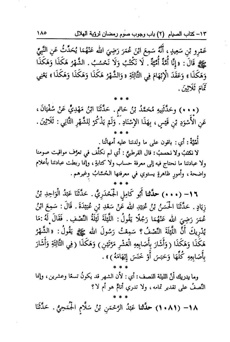 [1080] فَإِن أُغمي قَالَ الْقُرْطُبِيّ فِيهِ ضمير يعود على الْهلَال فَهُوَ الْمغمى عَلَيْهِ لَا الناظرون وأصل الْإِغْمَاء التغطية وَكَذَا الْغم يُقَال أغمى الْهلَال وغمي مخففا وغمى مشددا وغم مشددا أَربع لُغَات مَبْنِيا للْمَفْعُول فِي كلهَا فاقدروا لَهُ قيل مَعْنَاهُ ضيقوا لَهُ وقدروه تَحت السَّحَاب وَعَلِيهِ أَحْمد وَغَيره مِمَّن جوز صَوْم لَيْلَة الْغَيْم من رَمَضَان وق قدروه بِحِسَاب الْمنَازل وَقَالَ الْجُمْهُور قدرُوا لَهُ تَمام الْعدة ثَلَاثِينَ يَوْمًا يُقَال قدرت الشَّيْء اقدره بِالتَّخْفِيفِ وَقدرته بِالتَّشْدِيدِ بِمَعْنى وَاحِد وَيُؤَيِّدهُ رِوَايَة فاقدروا ثَلَاثِينَ وَرِوَايَة فأكملوا الْعدة ثَلَاثِينَ وَهُوَ مُفَسّر ل اقدروا لَهُ فَإِن غم أَي حَال بَيْنكُم وَبَينه غيم الشَّهْر تسع وَعِشْرُونَ قَالَ النَّوَوِيّ قَالُوا قد يَقع النَّص متواليا فِي شَهْرَيْن وَثَلَاثَة وَأَرْبع وَلَا يَقع أَكثر من أَرْبَعَة البكائي بِفَتْح الْبَاء وَتَشْديد الْكَاف أُميَّة أَي باقون على مَا ولدتنا عَلَيْهِ أمهاتنا لَا نكتب وَلَا نحسب قَالَ الْقُرْطُبِيّ أَي لم نكلف فِي تعرف مَوَاقِيت صومنا وَلَا عبادتنا مَا نحتاج فِيهِ إِلَى معرفَة حِسَاب وَلَا كِتَابَة وإنماربطت عبادتنا بأعلام وَاضِحَة وَأُمُور ظَاهِرَة يَسْتَوِي فِي مَعْرفَتهَا الْحساب وَغَيرهم وَمَا يدْريك أَن اللَّيْلَة النّصْف أَي لِأَن الشَّهْر قد يكون تسعا وَعشْرين وَإِنَّمَا النّصْف على تَقْدِير تَمَامه وَلَا تَدْرِي أتام هُوَ أم لَا