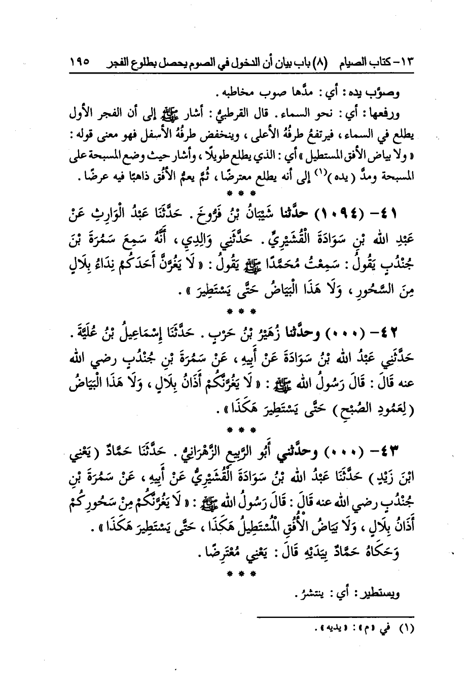[1093] من سحورهم بِفَتْح السِّين مَا يُؤْكَل فِي السحر وَبِضَمِّهَا الْفِعْل ليرْجع قائمكم بِنصب قائمكم مفعول يرجع أَي ليرد الْقَائِم إِلَى رَاحَته لينام غفوة ليُصبح نشيطا ويوقظ قائمكم أَي ليتأهب للصبح وَيفْعل مَا أَرَادَهُ من تهجد أَو إيتار أَو سحور أَو اغتسال أَو نَحْو ذَلِك وَصوب يَده أَي مدها صوب مخاطبه ورفعها أَي نَحْو السَّمَاء قَالَ الْقُرْطُبِيّ أَشَارَ صلى الله عَلَيْهِ وَسلم إِلَى أَن الْفجْر الأول يطلع فِي السَّمَاء فيرتفع طرفه الْأَعْلَى وينخفض طرفه الْأَسْفَل فَهُوَ معنى قَوْله وَلَا بَيَاض الْأُفق المستطيل أَي الَّذِي يطلع طَويلا وَأَشَارَ حَيْثُ وضع المسبحة على المسبحة وَمد يَده إِلَى أَن يطلع مُعْتَرضًا ثمَّ يعم الْأُفق ذَاهِبًا فِيهِ عرضا