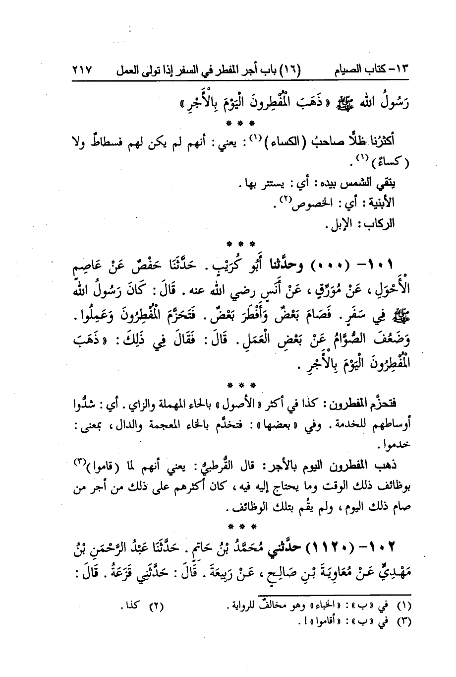 [1119] أكثرنا ظلا صَاحب الكساء يَعْنِي أَنهم لم يكن لَهُم فسطاط وَلَا كسَاء يَتَّقِي الشَّمْس بِيَدِهِ أَي يسْتَتر بهَا الْأَبْنِيَة أَي الْخُصُوص الركاب الْإِبِل فتحزم المفطرون كَذَا فِي أَكثر الْأُصُول بِالْحَاء الْمُهْملَة وَالزَّاي أَي شدوا أوساطهم للْخدمَة وَفِي بَعْضهَا فتخدم بِالْحَاء الْمُعْجَمَة وَالدَّال بِمَعْنى خدموا ذهب المفطرون الْيَوْم بِالْأَجْرِ قَالَ الْقُرْطُبِيّ يَعْنِي أَنهم لما قَامُوا بوظائف ذَلِك الْوَقْت وَمَا يحْتَاج إِلَيْهِ فِيهِ كَانَ أَكْثَرهم على ذَلِك من أجر من صَامَ ذَلِك الْيَوْم وَلم يقم بِتِلْكَ الْوَظَائِف