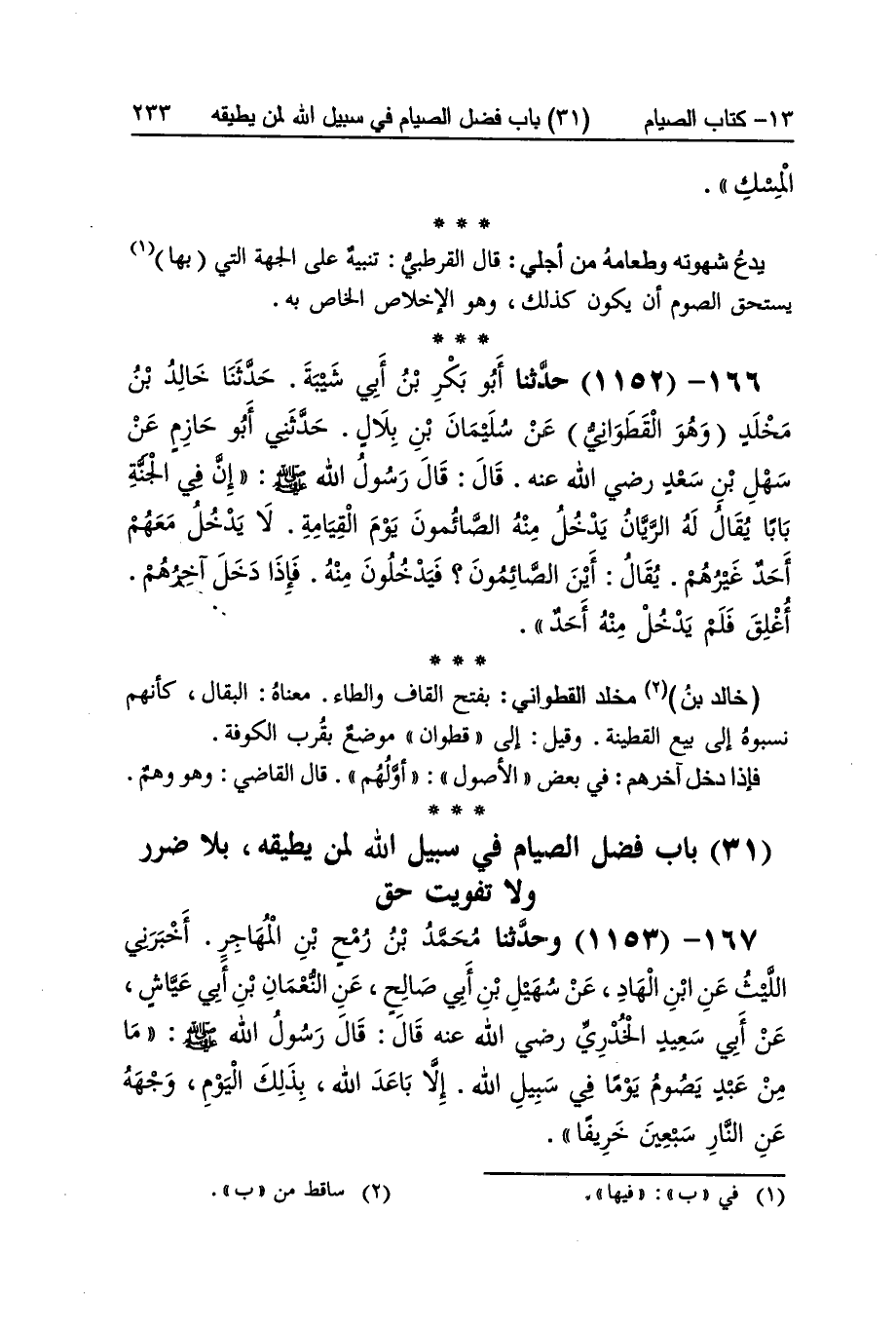 [1152] خَالِد بن مخلد الْقَطوَانِي بِفَتْح الْقَاف والطاء مَعْنَاهُ الْبَقَّال كَأَنَّهُمْ نسبوه إِلَى بيع القطينة وَقيل إِلَى قطوان مَوضِع بِقرب الْكُوفَة فَإِذا دخل آخِرهم فِي بعض الْأُصُول أَوَّلهمْ قَالَ القَاضِي وَهُوَ وهم