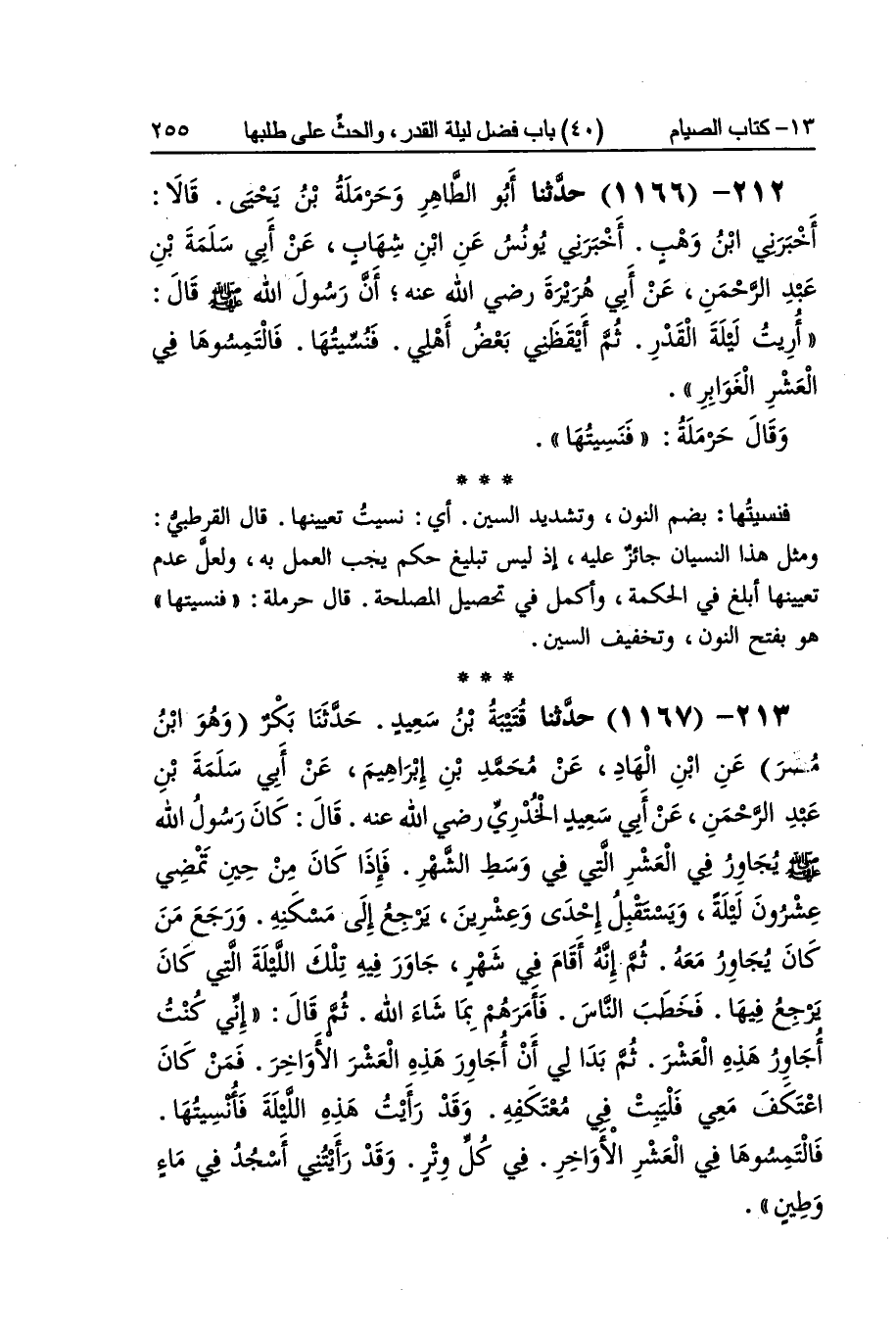 [1166] فنسيتها بِضَم النُّون وَتَشْديد السِّين أَي نسيت تَعْيِينهَا قَالَ الْقُرْطُبِيّ وَمثل هَذَا النسْيَان جَائِز عَلَيْهِ إِذْ لَيْسَ تَبْلِيغ حكم يجب الْعَمَل بِهِ وَلَعَلَّ عدم تَعْيِينهَا أبلغ فِي الْحِكْمَة وأكمل فِي تَحْصِيل الْمصلحَة قَالَ حَرْمَلَة فنسيتها هُوَ بِفَتْح النُّون وَتَخْفِيف السبن