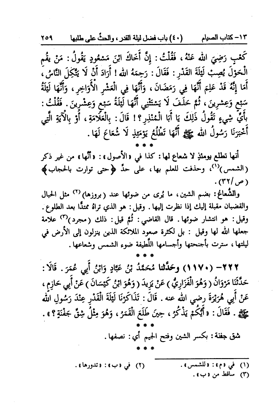 [762] أَنَّهَا تطلع يَوْمئِذٍ لَا شُعَاع لَهَا كَذَا فِي الْأُصُول أَنَّهَا من غير ذكر الشَّمْس وحذفت للْعلم بهَا على حد حتىتوارت بالحجاب والشعاع بِضَم الشين مَا يرى من ضوئها عِنْد بروزها مثل الحبال والقضبان مقبلة إِلَيْك إِذا نظرت إِلَيْهَا وَقيل هُوَ الَّذِي ترَاهُ ممتدا بعد الطُّلُوع وَقيل هُوَ انتشار ضوئها قَالَ القَاضِي ثمَّ قيل ذَلِك مُجَرّد عَلامَة جعلهَا الله لَهَا وَقيل بل لِكَثْرَة صعُود الْمَلَائِكَة الَّذين ينزلون إِلَى الأَرْض فِي لَيْلَتهَا سترت بأجنحتها وأجسامها اللطيفة ضوء الشَّمْس وشعاعها
