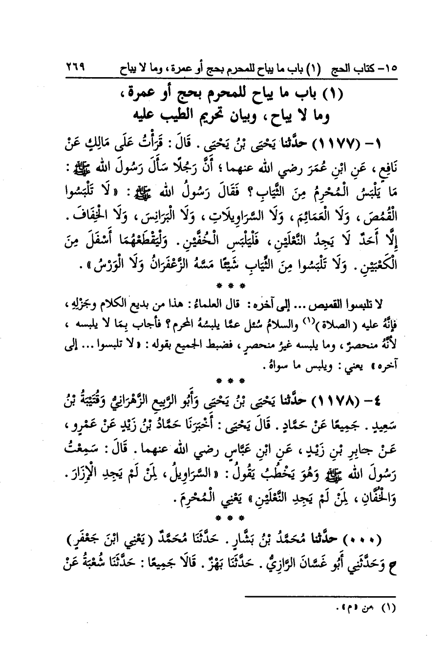 [1177] لَا تلبسوا الْقَمِيص إِلَى آخِره قَالَ الْعلمَاء هَذَا من بديع الْكَلَام وجزله فَإِنَّهُ عَلَيْهِ الصَّلَاة وَالسَّلَام سُئِلَ عَمَّا يلْبسهُ الْمحرم فَأجَاب بِمَا لَا يلْبسهُ لِأَنَّهُ منحصر وَمَا يلْبسهُ غير منحصر فضبط الْجَمِيع بقوله لَا تلبسوا إِلَى آخِره يَعْنِي ويلبس مَا سواهُ