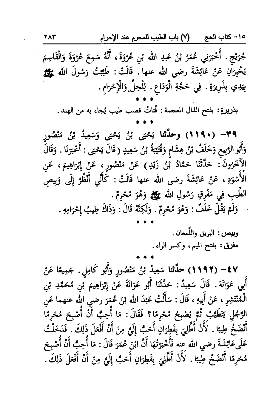 [1189] لحرمه ضبط بِضَم الْحَاء وَكسرهَا أَي إِحْرَامه بِالْحَجِّ بذريرة بِفَتْح الذَّال الْمُعْجَمَة فتات قصب طيب يجاء بِهِ من الْهِنْد
