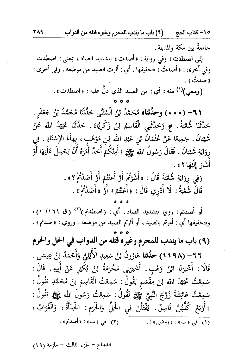 [1196] بالقاحة بِالْقَافِ والحاء الْمُهْملَة المخففة وَاد على ثَلَاث مراحل من الْمَدِينَة وصحف من قَالَه بِالْفَاءِ وَهُوَ غير محرم قَالَ النَّوَوِيّ فَإِن قيل كَيفَ جَاوز الْمِيقَات وَهُوَ غير محرم فَالْجَوَاب أَن الْمَوَاقِيت لم تكن وقتت بعد وَقيل لِأَن النَّبِي صلى الله عَلَيْهِ وَسلم بَعثه ورفقته لكشف عَدو بِجِهَة السَّاحِل وَقيل بل بَعثه أهل الْمَدِينَة إِلَى النَّبِي صلى الله عَلَيْهِ وَسلم بعد خُرُوجه ليعلمه أَن بعض الْأَعْرَاب يقصدون الإغارة على الْمَدِينَة طعمة بِضَم الطَّاء أَي طَعَام يضْحك بَعضهم إِلَيّ قَالَ النَّوَوِيّ كَذَا وَقع فِي جَمِيع نسخ بِلَادنَا إِلَيّ بتَشْديد الْيَاء قَالَ القَاضِي وَهُوَ خطأ وَوَقع فِي رِوَايَة بعض الروَاة عَن مُسلم إِلَى بعض فأسقط لَفْظَة بعض وَالصَّوَاب إِثْبَاتهَا بغيقة بغين مُعْجمَة مَفْتُوحَة ثمَّ يَاء مثناة تحتية سَاكِنة ثمَّ قَاف مَفْتُوحَة مَوضِع فِي بِلَاد بني غفار بَين مَكَّة وَالْمَدينَة أرفع فرسي شأوا وأسير شأوا بالشين الْمُعْجَمَة مَهْمُوز أَي طلقا وَالْمعْنَى أركضه شَدِيدا وقتا وأسوقه بسهولة وقتا بتعهن بمثناة فَوق مَكْسُورَة ومفتوحة ثمَّ عين مُهْملَة سَاكِنة ثمَّ هَاء مُهْملَة مَكْسُورَة ثمَّ نون مَاء هُنَاكَ على ثَلَاثَة أَمْيَال من السقيا وَهُوَ قَائِل بِهَمْزَة من القيلولة أَي فِي عزمه أَن يقيل بالسقيا وَرُوِيَ بِالْبَاء الْمُوَحدَة وَهُوَ تَصْحِيف السقيا بِضَم السِّين الْمُهْملَة وَسُكُون الْقَاف ثمَّ مثناة تَحت مَقْصُور قَرْيَة جَامِعَة بَين مَكَّة وَالْمَدينَة إِنِّي اصطدت وَفِي رِوَايَة أصدت بتَشْديد الصَّاد بِمَعْنى اصطدت وَفِي أُخْرَى أصدت بتخفيفها أَي أثرت الصَّيْد من مَوْضِعه وَفِي أُخْرَى صدت وَمَعِي مِنْهُ أَي من الصَّيْد الَّذِي دلّ عَلَيْهِ اصطدت أَو أصدتم رُوِيَ بتَشْديد الصَّاد أَي اصطدتم وبتخفيفها أَي أمرْتُم بالصيد أَو أثرتم الصَّيْد من مَوْضِعه وَرُوِيَ صدتم