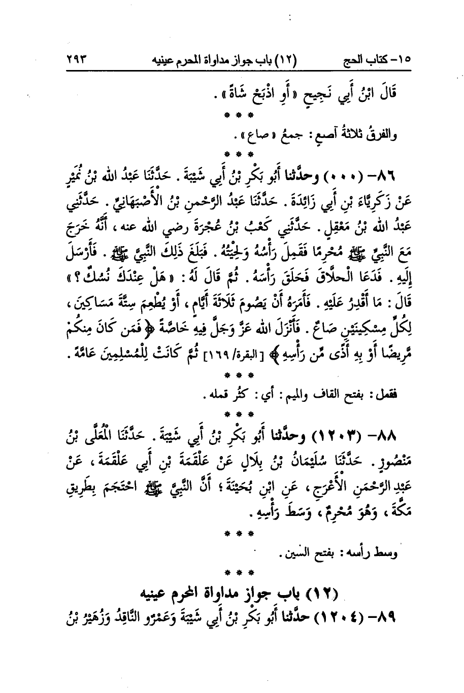[1201] عجْرَة بِضَم الْعين وَسُكُون الْجِيم هوَام رَأسك أَي الْقمل انسك بِضَم السِّين وَكسرهَا نسيكة هِيَ الشَّاة وَغَيرهَا مِمَّا يُجزئ فِي الْأُضْحِية يتهافت أَي يتساقط ويتناثر بفرق بِفَتْح الْفَاء وسكونها وَالْفرق ثَلَاثَة آصَع جمع صَاع فقمل بِفَتْح الْقَاف وَالْمِيم أَي كثر قمله