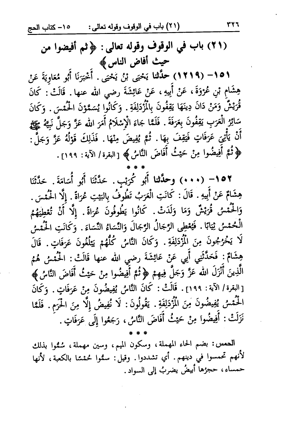 [1218] دَخَلنَا على جَابر بن عبد الله قَالَ النَّوَوِيّ حَدِيث جَابر هَذَا حَدِيث عَظِيم مُشْتَمل على جمل من الْفَوَائِد ونفائس من مهمات الْقَوَاعِد وَهُوَ من أَفْرَاد مُسلم عَن البُخَارِيّ قَالَ القَاضِي وَقد تكلم النَّاس على مَا فِيهِ من الْفِقْه وَأَكْثرُوا وَألف فِيهِ بن الْمُنْذر جُزْء كَبِيرا وَخرج فِيهِ من الْفِقْه نيفا وَخمسين نوعا وَلَو تقضى لزاد على هَذَا الْعدَد قَرِيبا مِنْهُ فِي نساجة قَالَ النَّوَوِيّ كَذَا فِي نسخ بِلَادنَا بِكَسْر النُّون وَتَخْفِيف السِّين الْمُهْملَة وجيم قيل مَعْنَاهُ ثوب ملفق وَقَالَ القَاضِي هِيَ رِوَايَة الْفَارِسِي وَهُوَ خطأ وتصحيف وَرِوَايَة الْجُمْهُور ساجه بِحَذْف النُّون وَهُوَ الطيلسان وَقيل الْأَخْضَر خَاصَّة وَقَالَ الْأَزْهَرِي هُوَ طيلسان مقور المشجب أَعْوَاد تُوضَع عَلَيْهَا الثِّيَاب ومتاع الْبَيْت عَن حجَّة رَسُول الله صلى الله عَلَيْهِ وَسلم بِكَسْر الْحَاء وَفتحهَا وَالْمرَاد حجَّة الْوَدَاع مكث تسع سِنِين لم يحجّ أَي بعد الْهِجْرَة أذن أَي أعلم واستثفري بمثلثة قبل الْفَاء وَهِي أَن تشد فِي وَسطهَا شَيْئا وَتَأْخُذ خرقَة عريضة تجعلها فِي مَحل الدَّم وتشد طرفيها من قدامها وَمن وَرَائِهَا فِي ذَلِك المشدود فِي وَسطهَا وَذَلِكَ شَبيه بثفر الدَّابَّة الْقَصْوَاء بِفَتْح الْقَاف وَالْمدّ اسْم نَاقَة النَّبِي صلى الله عَلَيْهِ وَسلم قَالَ القَاضِي وَقع فِي رِوَايَة العذري القصوى بِضَم الْقَاف وَالْقصر وَهُوَ خطأ ثمَّ قَالَ جمَاعَة هُوَ والجدعاء والعضباء اسْم لناقة وَاحِدَة وَقَالَ بن قُتَيْبَة هن ثَلَاث نُوق لَهُ صلى الله عَلَيْهِ وَسلم وَقَالَ بن الْأَعرَابِي والأصمعي القصوى هِيَ الَّتِي قطع طرف أذنها والجدع أَكثر مِنْهُ فَإِذا جَاوز الرّبع فَهِيَ عضباء وَقَالَ أَبُو عُبَيْدَة الْقَصْوَاء المقطوعة الْأذن عرضا والعضباء المقطوعة النّصْف فَمَا فَوق وَقَالَ الْخَلِيل العضباء المشقوقة الْأذن الْبَيْدَاء الْمَفَازَة نظرت مد بَصرِي أَي مُنْتَهى بَصرِي وَأنكر بعض أهل اللُّغَة ذَلِك وَقَالَ الصَّوَاب مدى بَصرِي وَقَالَ النَّوَوِيّ وَلَيْسَ بمنكر بل هما لُغَتَانِ والمدى أشهر وَعَلِيهِ ينزل الْقُرْآن وَهُوَ يعرف تَأْوِيله مَعْنَاهُ الْحَث على التَّمَسُّك بِمَا أخْبركُم عَن فعله فِي حجَّته تِلْكَ فَأهل بِالتَّوْحِيدِ أَي مُخَالفَة لما كَانَت الْجَاهِلِيَّة تَقوله فِي تلبيتها من لفظ الشّرك وَأهل النَّاس بِهَذَا الَّذِي يهلون بِهِ الْيَوْم قَالَ القَاضِي كَقَوْل بن عمر لبيْك ذَا النعماء وَالْفضل الْحسن لبيْك مرهوبا مِنْك مرغوبا إِلَيْك لبيْك وَسَعْديك وَالْخَيْر بيديك وَالرغْبَاء إِلَيْك وَالْعَمَل وكقول أنس لبيْك حَقًا تعبدا وَرقا لَا أعلمهُ ذكره إِلَّا عَن النَّبِي صلى الله عَلَيْهِ وَسلم قَالَ النَّوَوِيّ لَيْسَ شكا فِي رَفعه لِأَن لَفْظَة الْعلم تنَافِي الشَّك بل هُوَ جزم بِرَفْعِهِ وَقد روى الْبَيْهَقِيّ بِإِسْنَاد صَحِيح على شَرط مُسلم عَن جَعْفَر بن مُحَمَّد عَن أَبِيه عَن جَابر أَن النَّبِي صلى الله عَلَيْهِ وَسلم طَاف بِالْبَيْتِ فَرمَلَ من الْحجر الْأسود ثَلَاثًا ثمَّ صلى رَكْعَتَيْنِ فَقَرَأَ فيهمَا قل يَا أَيهَا الْكَافِرُونَ وَقل هُوَ الله أحد قَالَ النَّوَوِيّ أَي قل يَا أَيهَا الْكَافِرُونَ فِي الرَّكْعَة الأولى وَقل هُوَ الله أحد فِي الثَّانِيَة بعد الْفَاتِحَة وَهزمَ الْأَحْزَاب هم الَّذين تحزبوا على رَسُول الله صلى الله عَلَيْهِ وَسلم يَوْم الخَنْدَق وَكَانَت الخَنْدَق فِي شَوَّال سنة أَربع وَقيل سنة خمس وَحده أَي بِغَيْر قتال من الْآدَمِيّين وَلَا سَبَب من جهتهم حَتَّى انصبت قدماه فِي بطن الْوَادي قَالَ القَاضِي كَذَا فِي الْأُصُول وَفِيه إِسْقَاط أَي رمل فِي بطن الْوَادي فَسَقَطت لَفْظَة وَرمل وَلَا بُد مِنْهَا وَقد ثبتَتْ فِي غي