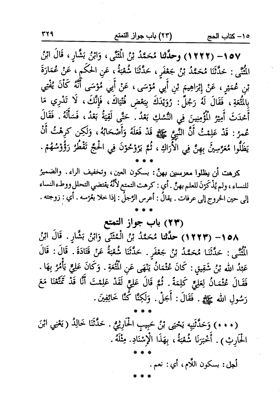 [1222] كرهت أَن يظلوا معرسين بِهن بِسُكُون الْعين وَتَخْفِيف الرَّاء وَالضَّمِير للنِّسَاء وَلم يذكرن للْعلم بِهن أَي كرهت التَّمَتُّع لِأَنَّهُ يَقْتَضِي التَّحَلُّل وَوَطْء النِّسَاء إِلَى حِين الْخُرُوج إِلَى عَرَفَات يُقَال أعرس الرجل إِذا خلا بعرسه أَي زَوجته