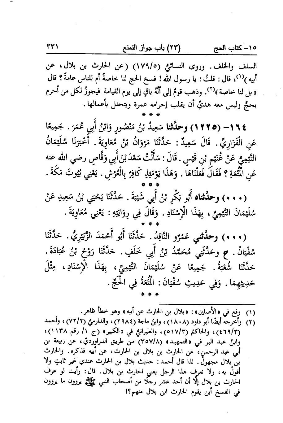[1224] كَانَت الْمُتْعَة فِي الْحَج لأَصْحَاب مُحَمَّد خَاصَّة قَالَ النَّوَوِيّ أَي فسخ الْحَج إِلَى الْعمرَة وعَلى هَذَا مَالك وَالشَّافِعِيّ وَأَبُو حنيفَة وجماهير من السّلف وَالْخلف وروى النَّسَائِيّ عَن الْحَارِث بن بِلَال عَن أَبِيه قَالَ قلت يَا رَسُول الله فسخ الْحَج لنا خَاصَّة أم للنَّاس عَامَّة قَالَ بل لنا خَاصَّة وَذهب قوم إِلَى أَنه بَاقٍ إِلَى يَوْم الْقِيَامَة فَيجوز لكل من أحرم بِحَجّ وَلَيْسَ مَعَه هدي أَن يقلب إِحْرَامه عمْرَة ويتحلل بأعمالها