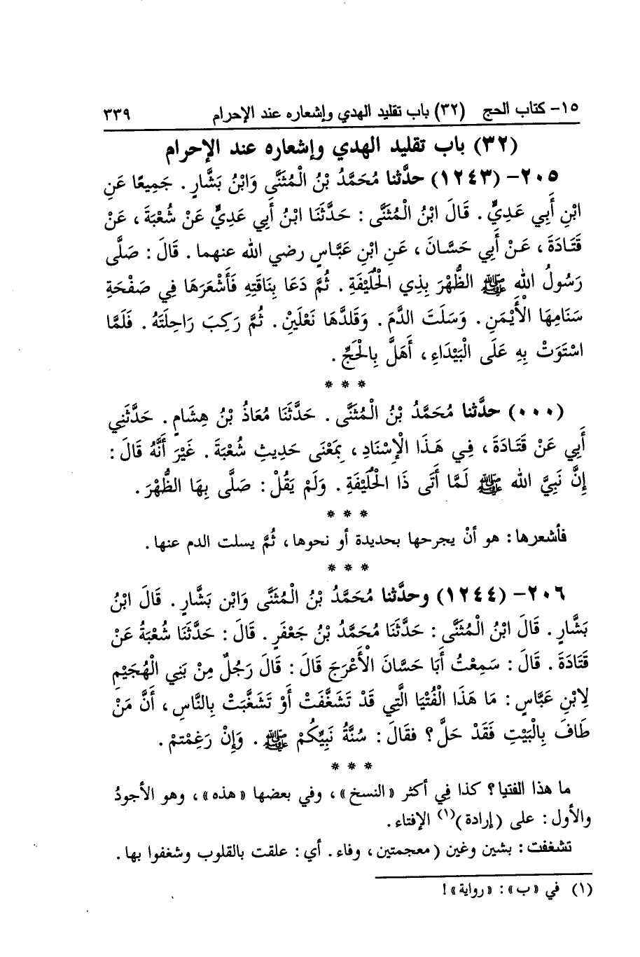[1243] فأشعرها هُوَ أَن يجرحها بحديدة أَو نَحْوهَا ثمَّ يَسْلت الدَّم عَنْهَا