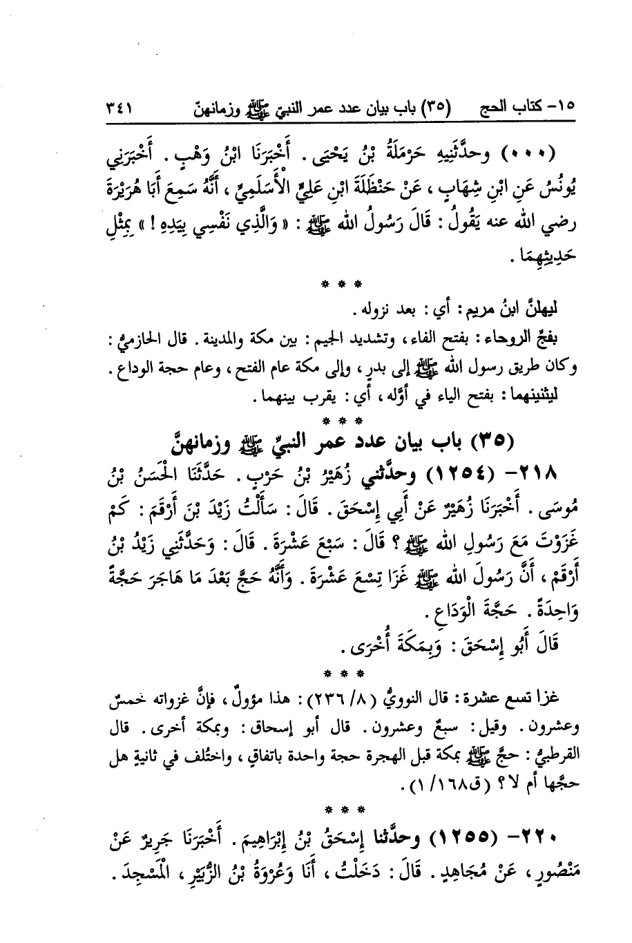 [1254] غزا تسع عشرَة قَالَ النَّوَوِيّ هَذَا مؤول فَإِن غَزَوَاته خمس وَعِشْرُونَ وَقيل سبع وَعِشْرُونَ قَالَ أَبُو إِسْحَاق وبمكة أُخْرَى قَالَ الْقُرْطُبِيّ حج صلى الله عَلَيْهِ وَسلم بِمَكَّة قبل الْهِجْرَة حجَّة وَاحِدَة بِاتِّفَاق وَاخْتلف فِي ثَانِيَة هَل حَجهَا أم لَا
