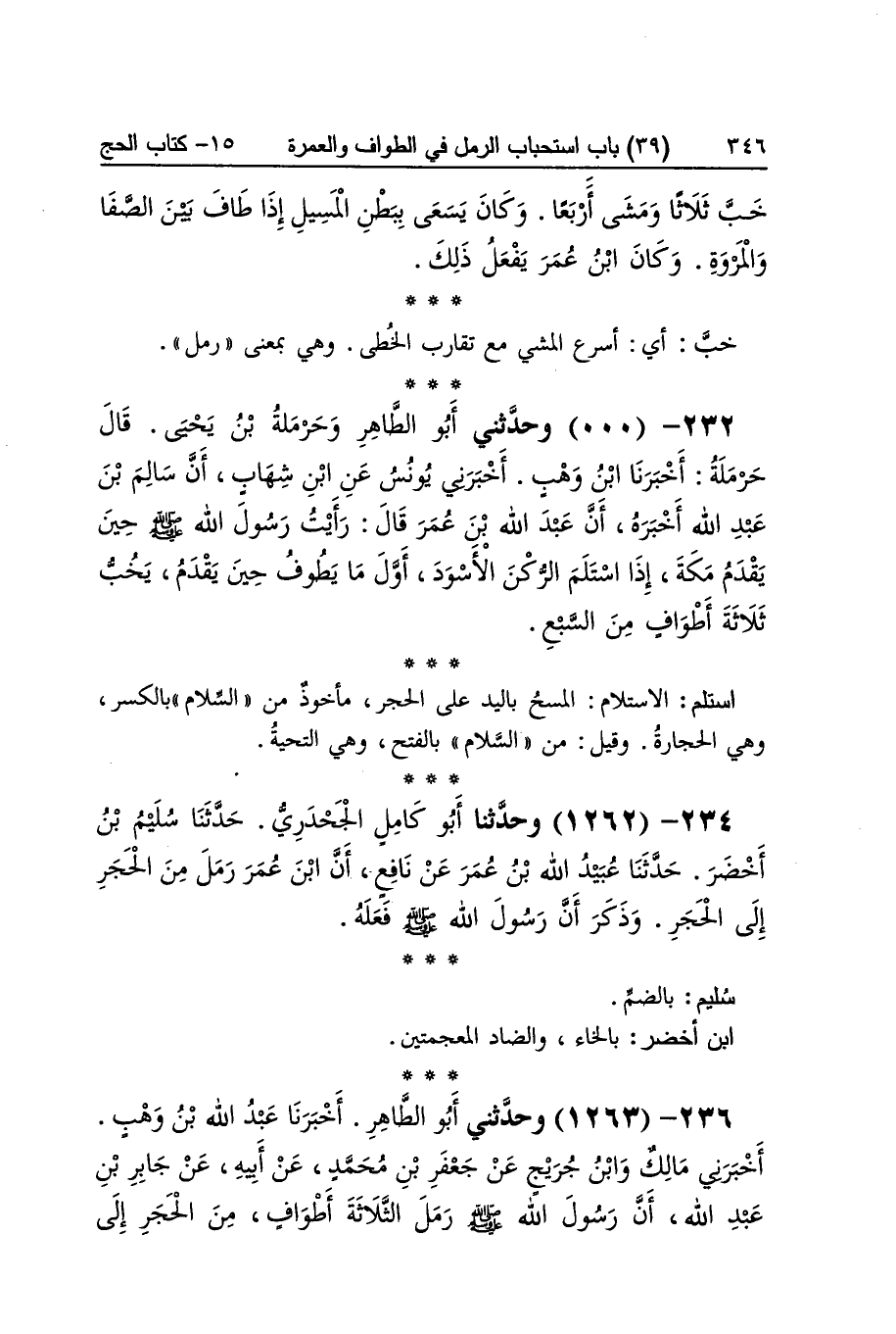 [1261] خب أَي أسْرع الْمَشْي مَعَ تقَارب الخطى وَهُوَ بِمَعْنى رمل اسْتَلم الاستلام الْمسْح بِالْيَدِ على الْحجر مَأْخُوذ من السَّلَام بِالْكَسْرِ وَهِي الْحِجَارَة وَقيل من السَّلَام بِالْفَتْح وَهِي التَّحِيَّة