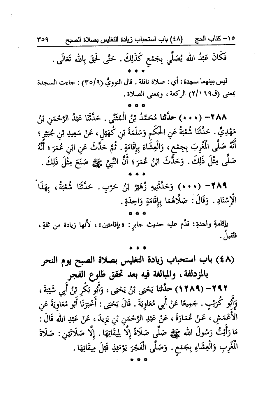 [1288] لَيْسَ بَينهمَا سَجْدَة أَي صَلَاة نَافِلَة قَالَ النَّوَوِيّ جَاءَت السَّجْدَة بِمَعْنى الرَّكْعَة وَبِمَعْنى الصَّلَاة بِإِقَامَة وَاحِدَة قدم عَلَيْهِ حَدِيث جَابر بإقامتين لِأَنَّهَا زِيَادَة من ثِقَة فَتقبل