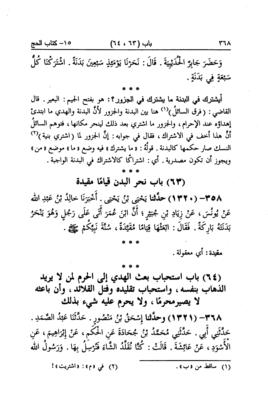 [1316] من نَبِيذ هُوَ مَا يحلى من زبيب وَغَيره بِحَيْثُ لَا يسكر أَحْسَنْتُم وَأَجْمَلْتُمْ أَي فَعلْتُمْ الْحسن الْجَمِيل أيشترك فِي الْبَدنَة مَا يشْتَرك فِي الْجَزُور هُوَ بِفَتْح الْجِيم الْبَعِير قَالَ القَاضِي فرق السَّائِل هُنَا بَين الْبَدنَة وَالْجَزُور لِأَن الْبَدنَة وَالْهَدْي مَا ابتدئ إهداؤه عِنْد الْإِحْرَام وَالْجَزُور مَا اشْترى بعد ذَلِك لينحر مَكَانهَا فَتوهم السَّائِل أَن هَذَا أخف فِي الِاشْتِرَاك فَقَالَ فِي جَوَابه إِن الْجَزُور لما اشْترِي بنية النّسك صَار حكمهَا كالبدنة قَوْله مَا يشْتَرك فِيهِ وضع مَا مَوضِع من وَيجوز أَن تكون مَصْدَرِيَّة أَي إشتراكا كالاشتراك فِي الْبَدنَة الْوَاجِبَة