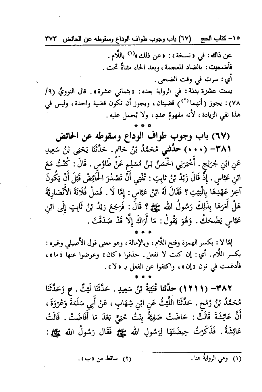 [1325] الضبعِي بِضَم الضَّاد الْمُعْجَمَة وَفتح الْمُوَحدَة فأزحفت عَلَيْهِ قَالَ النَّوَوِيّ لَا خلاف بَين الْمُحدثين أَنه بِفَتْح الْهمزَة وَسُكُون الزَّاي وَفتح الْحَاء الْمُهْملَة قَالَ الْخطابِيّ كَذَا يَقُوله المحدثون وَصَوَابه والأجود بِضَم الْهمزَة يُقَال زحف الْبَعِير إِذا قَامَ وأزحفه السّير ورده النَّوَوِيّ بِأَن الْهَرَوِيّ والجوهري حكيا زحف الْبَعِير وأزحف لُغَتَانِ وأزحفه السّير وَمعنى زحف وقف من الكلال والإعياء فعيي بشأنها كَذَا للأكثرين بيائين من الإعياء وَهُوَ الْعَجز أَي عجز عَن معرفَة حكمهَا لَو عطبت عَلَيْهِ فِي الطَّرِيق فَكيف يعْمل بهَا وَرُوِيَ فعي بياء وَاحِدَة مُشَدّدَة وَهِي لُغَة بِمَعْنى الأول وَرُوِيَ فعني بِضَم الْعين وَكسر النُّون من الْعِنَايَة بالشَّيْء والاهتمام بِهِ إِن هِيَ أبدعت بِضَم الْهمزَة وَكسر الدَّال وَفتح الْعين وَسُكُون التَّاء أَي كلت وأعيت ووقفت قَالَ أَبُو عبيد قَالَ بعض الْعَرَب لَا يكون الإبداع إِلَّا بضلع كَيفَ يَأْتِي لَهَا فِي نُسْخَة بهَا لَئِن قدمت الْبَلَد فِي نُسْخَة اللَّيْلَة وَكِلَاهُمَا صَحِيح لأستحفين بحاء مُهْملَة وَفَاء أَي لأسألن سؤالا بليغا يُقَال أحفى فِي الْمَسْأَلَة أَي ألح فِيهَا وَأكْثر مِنْهَا عَن ذَاك فِي نُسْخَة عَن ذَلِك بِاللَّامِ فأضحيت بالضاد الْمُعْجَمَة وَبعد الْحَاء مثناة تَحت أَي سرت فِي وَقت الضُّحَى بست عشرَة بَدَنَة فِي الرِّوَايَة بعده بثماني عشرَة قَالَ النَّوَوِيّ يجوز أَنَّهُمَا قضيتان وَيجوز أَن تكون قَضِيَّة وَاحِدَة وَلَيْسَ فِي هَذَا نفي الزِّيَادَة لِأَنَّهُ مَفْهُوم عدد وَلَا يحمل عَلَيْهِ إِمَّا لَا بِكَسْر الْهمزَة وَفتح اللَّام وبالإمالة وَهُوَ معنى قَول الْأصيلِيّ وَغَيره بِكَسْر اللَّام أَي إِن كنت لَا تفعل حذفوا كَانَ وعوضوا عَنْهَا مَا فأدغمت فِي نون إِن واكتفوا عَن الْفِعْل ب لَا
