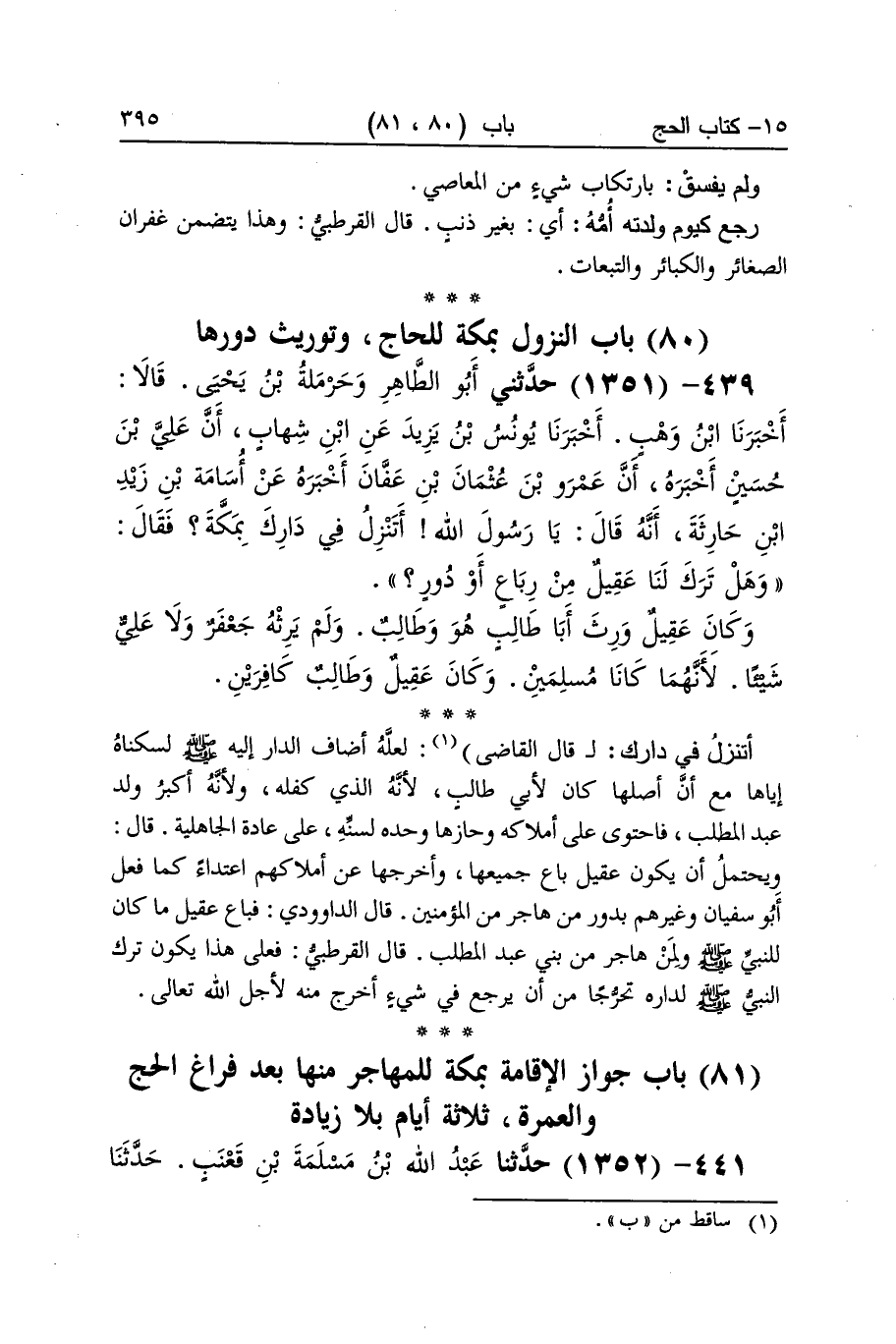 [1351] أتنزل فِي دَارك ل قَالَ القَاضِي لَعَلَّه أضَاف الدَّار إِلَيْهِ صلى الله عَلَيْهِ وَسلم لسكناه إِيَّاهَا مَعَ أَن أَصْلهَا كَانَ لأبي طَالب لِأَنَّهُ الَّذِي كفله وَلِأَنَّهُ أكبر ولد عبد الْمطلب فاحتوى على أملاكه وحازها وَحده لسنه على عَادَة الْجَاهِلِيَّة قَالَ وَيحْتَمل أَن يكون عقيل بَاعَ جَمِيعهَا وأخرجها عَن أملاكهم اعتداء كَمَا فعل أَبُو سُفْيَان وَغَيرهم بدور من مهَاجر من الْمُؤمنِينَ قَالَ الداوودي فَبَاعَ عقيل مَا كَانَ للنَّبِي صلى الله عَلَيْهِ وَسلم وَلمن هَاجر من بني عبد الْمطلب قَالَ الْقُرْطُبِيّ فعلى هَذَا يكون ترك النَّبِي صلى الله عَلَيْهِ وَسلم لداره تحرجا من أَن يرجع فِي شَيْء أخرج مِنْهُ لأجل الله تَعَالَى