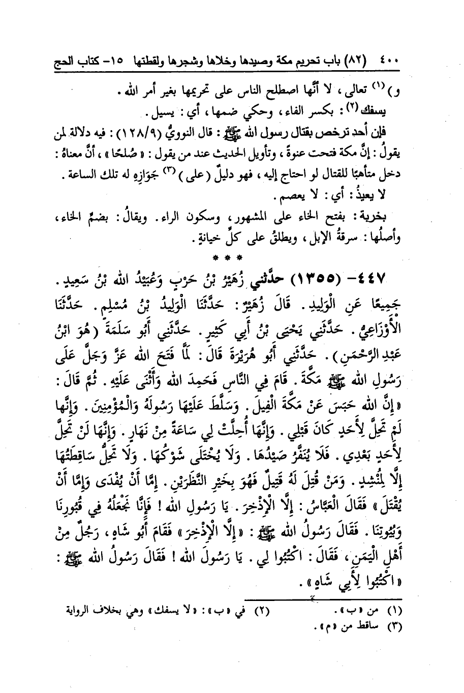 [1354] وَهُوَ يبْعَث الْبعُوث إِلَى مَكَّة يَعْنِي لقِتَال بن الزبير سمعته أذناي ووعاه قلبِي وأبصرته عَيْنَايَ أَرَادَ بِهَذَا الْمُبَالغَة فِي تَحْقِيق حفظه إِيَّاه وتيقنه زَمَانه ومكانه وَلَفظه حرمهَا الله وَلم يحرمها النَّاس مَعْنَاهُ أَن تَحْرِيمهَا بِوَحْي من الله سُبْحَانَهُ وَتَعَالَى لَا أَنَّهَا اصْطلحَ النَّاس على تَحْرِيمهَا بِغَيْر أَمر الله يسفك بِكَسْر الْفَاء وَحكي بضَمهَا أَي يسيل فَإِن أحد ترخص بِقِتَال رَسُول الله صلى الله عَلَيْهِ وَسلم قَالَ النَّوَوِيّ فِيهِ دلَالَة لمن يَقُول إِن مَكَّة فتحت عنْوَة وَتَأْويل الحَدِيث عِنْد من يَقُول صلحا أَن مَعْنَاهُ دخل متأهبا لِلْقِتَالِ لَو احْتَاجَ إِلَيْهِ فَهُوَ دَلِيل على جَوَازه لَهُ تِلْكَ السَّاعَة لَا يعيذ أَي لَا يعْصم بخربة بِفَتْح الْخَاء على الْمَشْهُور وَسُكُون الرَّاء وَيُقَال بِضَم الْخَاء وَأَصلهَا سَرقَة الْإِبِل وَيُطلق على كل خِيَانَة
