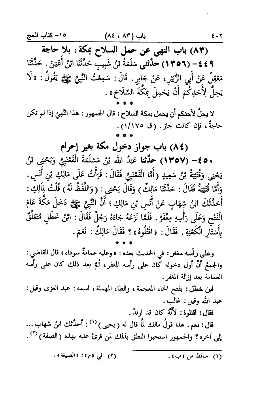 [1356] لَا يحل لأحدكم أَن يحمل بِمَكَّة السِّلَاح قَالَ الْجُمْهُور هَذَا النَّهْي إِذا لم تكن حَاجَة فَإِن كَانَت جَازَ