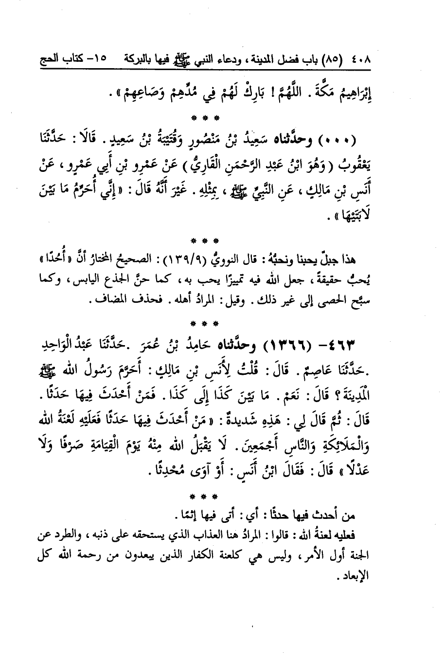 [1365] هَذَا جبل يحبنا ونحبه قَالَ النَّوَوِيّ الصَّحِيح الْمُخْتَار أَن أحدا يحب حَقِيقَة جعل الله فِيهِ تمييزا يحب بِهِ كَمَا حن الْجذع الْيَابِس وكما سبح الْحَصَى إِلَى غير ذَلِك وَقيل المُرَاد أَهله فَحذف الْمُضَاف