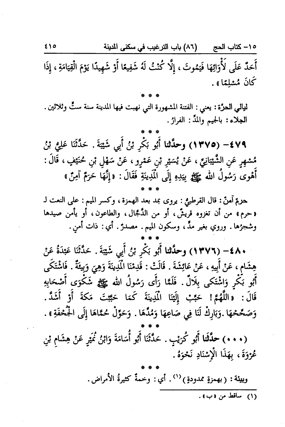 [1375] حرم آمن قَالَ الْقُرْطُبِيّ يرْوى بِمد بعد الْهمزَة وَكسر الْمِيم على النَّعْت لحرم من أَن تغزوه قُرَيْش أَو من الدَّجَّال والطاعون أَو يَأْمَن صيدها وشجرها وَرُوِيَ بِغَيْر مد وَسُكُون الْمِيم مصدر أَي ذَات أَمن