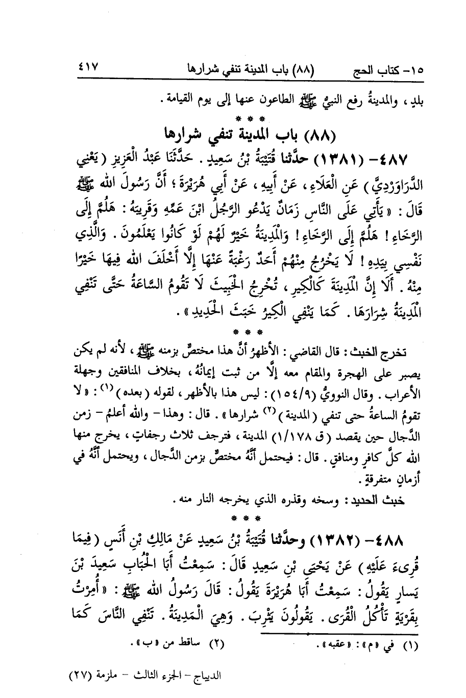 [1381] تخرج الْخبث قَالَ القَاضِي الْأَظْهر أَن هَذَا مُخْتَصّ بزمنه صلى الله عَلَيْهِ وَسلم لِأَنَّهُ لم يكن يصبر على الْهِجْرَة وَالْمقَام مَعَه إِلَّا من ثَبت إيمَانه بِخِلَاف الْمُنَافِقين وجهلة الْأَعْرَاب وَقَالَ النَّوَوِيّ لَيْسَ هَذَا بالأظهر لقَوْله بعده لَا تقوم السَّاعَة حَتَّى تَنْفِي الْمَدِينَة شِرَارهَا قَالَ وَهَذَا وَالله أعلم زمن الدَّجَّال حِين يقْصد الْمَدِينَة فترجف ثَلَاث رجفات يخرج مِنْهَا الله كل كَافِر ومنافق قَالَ فَيحْتَمل أَنه مُخْتَصّ بِزَمن الدَّجَّال وَيحْتَمل أَنه فِي أزمان مُتَفَرِّقَة خبث الْحَدِيد وسخه وقذره الَّذِي يُخرجهُ النَّار مِنْهُ
