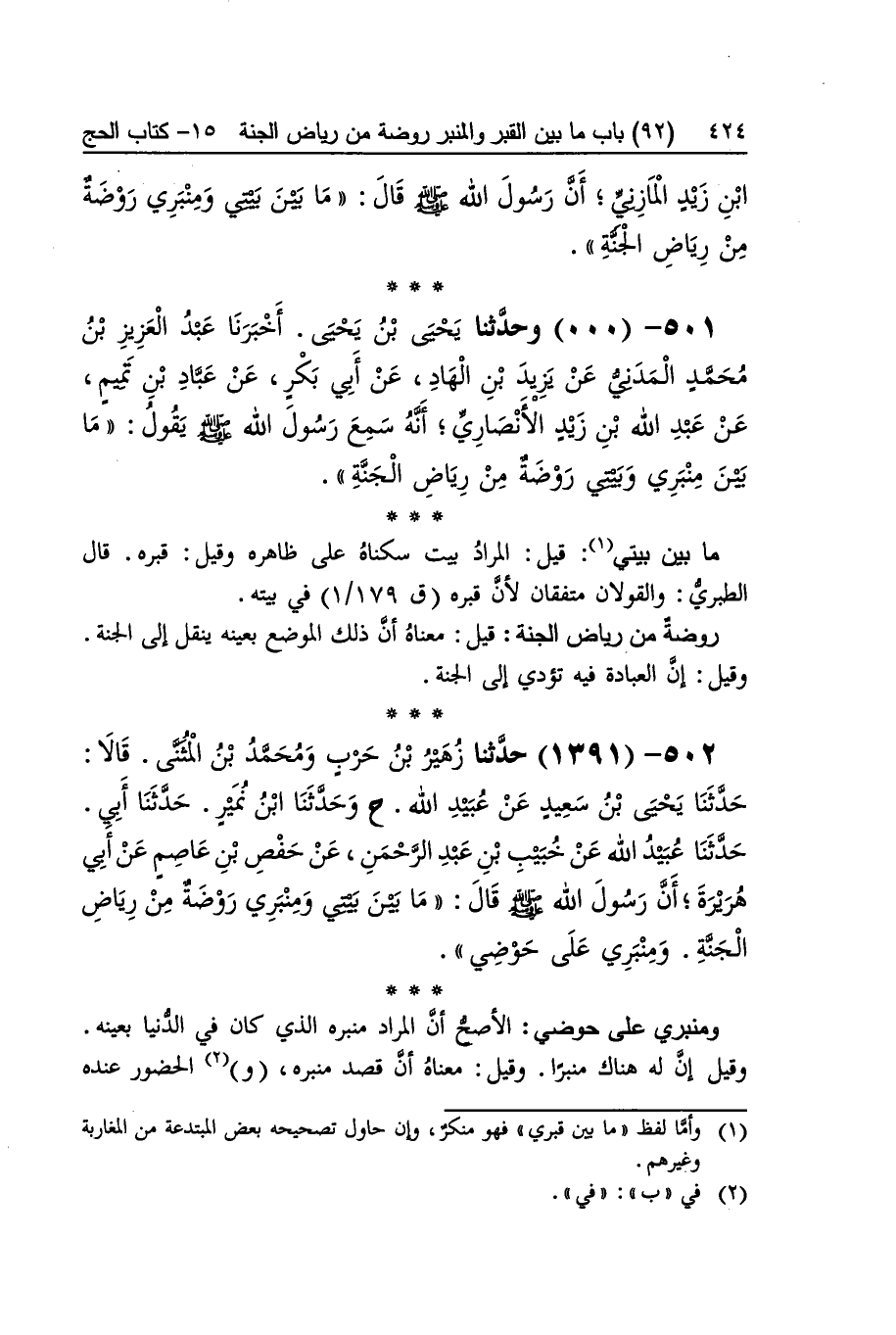 [1390] مَا بَين بَيْتِي قيل المُرَاد بَيت سكناهُ على طاهره وَقيل قَبره قَالَ الطَّبَرِيّ وَالْقَوْلَان متفقان لِأَن قَبره فِي بَيته رَوْضَة من رباض الْجنَّة قيل مَعْنَاهُ أَن ذَلِك الْموضع بِعَيْنِه ينْقل إِلَى الْجنَّة وَقيل إِن الْعِبَادَة فِيهِ تُؤدِّي إِلَى الْجنَّة