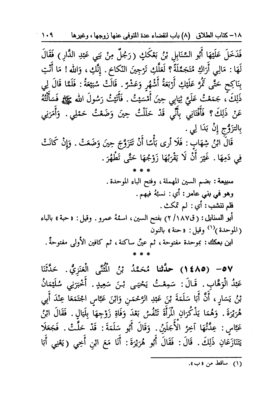 [1484] سبيعة بِضَم السِّين الْمُهْملَة وَفتح الْبَاء الْمُوَحدَة وَهُوَ فِي بني عَامر أَي نسبه فيهم فَلم تنشب أَي لم تمكث أَبُو السنابل بِفَتْح السِّين اسْمه عَمْرو وَقيل حَبَّة بِالْبَاء الْمُوَحدَة وَقيل حنة بالنُّون بن بعكك بموحدة مَفْتُوحَة ثمَّ عين سَاكِنة ثمَّ كافين الأولى مَفْتُوحَة
