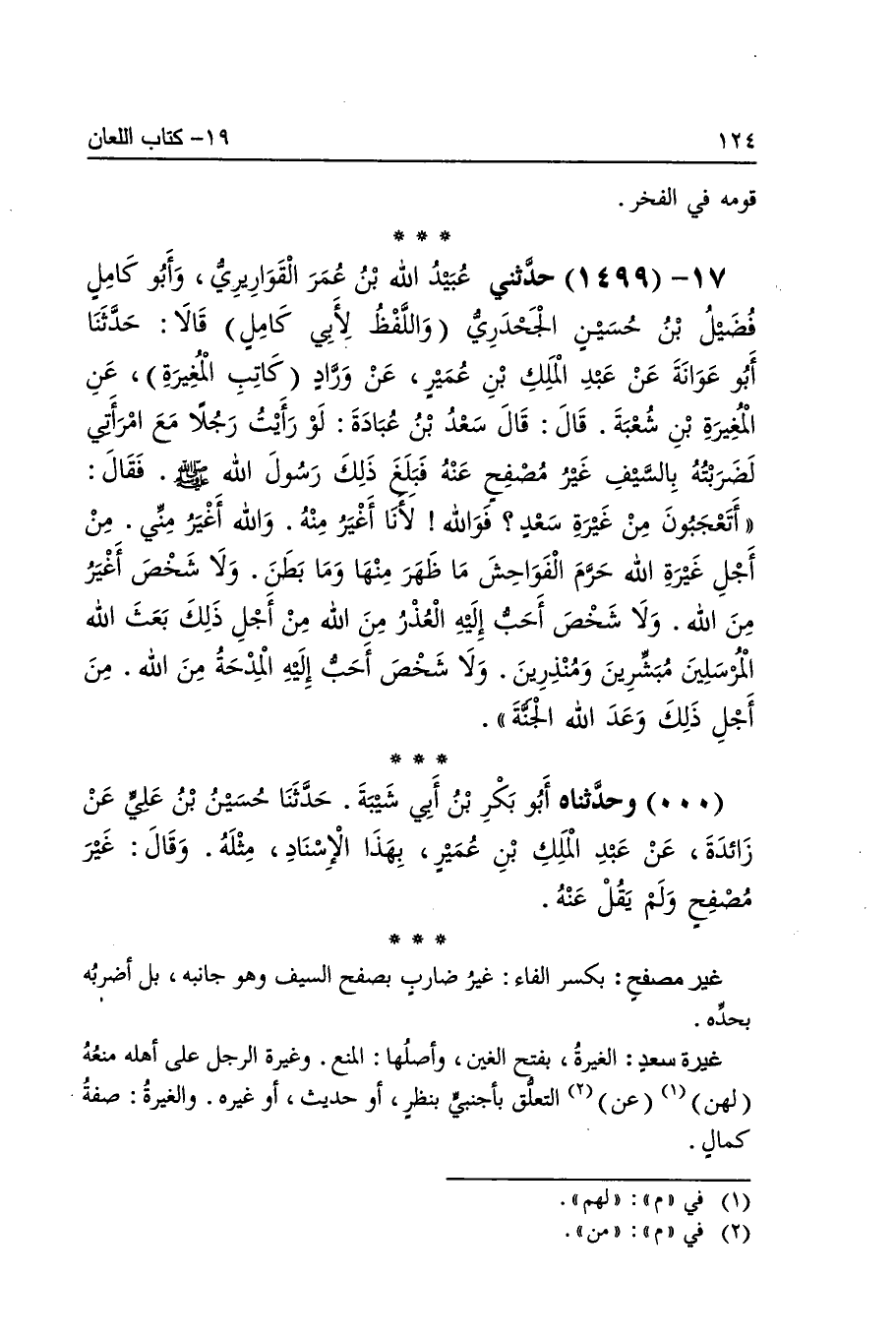 [1497] خدلا بِفَتْح الْخَاء الْمُعْجَمَة وَسُكُون الدَّال الْمُهْملَة الممتلئ السَّاق أعلنت أَي اشتهرت وشاع عَنْهَا الْفَاحِشَة قَالَ كلا وَالَّذِي بَعثك بِالْحَقِّ إِن كنت لأعالجه بِالسَّيْفِ قَالَ الْمَازرِيّ وَغَيره لَيْسَ هُوَ ردا لقَوْل رَسُول الله صلى الله عَلَيْهِ وَسلم وَمُخَالفَة من سعد لأَمره وَإِنَّمَا مَعْنَاهُ الْإِخْبَار عَن حَالَة الْإِنْسَان عِنْد رُؤْيَته الرجل مَعَ امْرَأَته واستيلاء الْغَضَب عَلَيْهِ فَإِنَّهُ يعالجه بِالسَّيْفِ وَإِن كَانَ عَاصِيا اسمعوا إِلَى مَا يَقُول سيدكم أَي تعجبوا من قَوْله وَالسَّيِّد الَّذِي يفوق قومه فِي الْفَخر