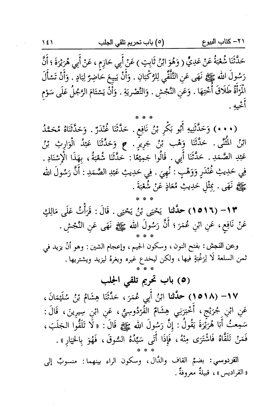 [1516] وَعَن النجش بِفَتْح النُّون وَسُكُون الْجِيم وإعجام الشين وَهُوَ أَن يزِيد فِي ثمن السّلْعَة لَا لرغبة فِيهَا وَلَكِن ليخدع غَيره ويغره ليزِيد ويشتريها