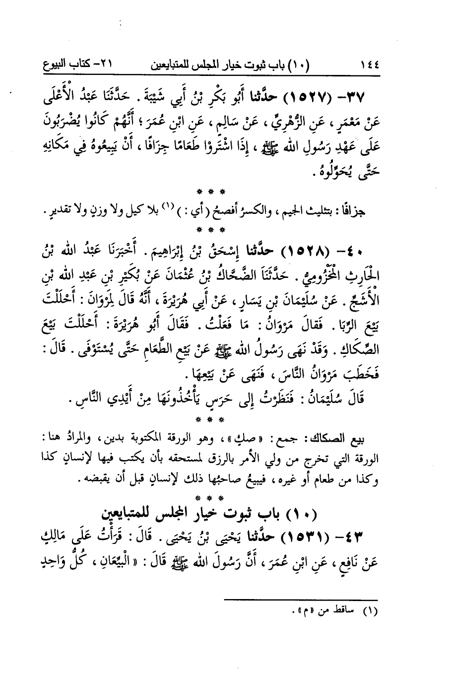 [1528] بيع الصكاك جمع صك وَهُوَ الورقة الْمَكْتُوبَة بدين وَالْمرَاد هُنَا الورقة الَّتِي تخرج من ولي الْأَمر بالرزق لمستحقه بِأَن يكْتب فِيهَا لإِنْسَان كَذَا وَكَذَا من طَعَام أَو غَيره فيبيع صَاحبهَا ذَلِك لإِنْسَان قبل أَن يقبضهُ