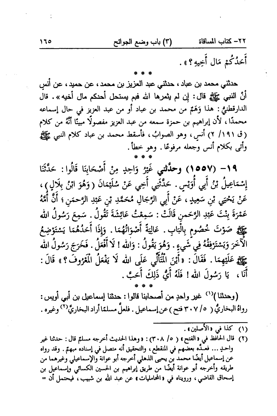 [1555] حَدثنِي مُحَمَّد بن عباد حَدثنِي عبد الْعَزِيز بن مُحَمَّد عَن حميد عَن أنس أَن النَّبِي صلى الله عَلَيْهِ وَسلم قَالَ إِن لم يثمرها الله فَبِمَ يسْتَحل أحدكُم مَال أَخِيه قَالَ الدَّارَقُطْنِيّ هَذَا وهم من مُحَمَّد بن عباد أَو من عبد الْعَزِيز فِي حَال إسماعه مُحَمَّدًا لِأَن إِبْرَاهِيم بن حَمْزَة سَمعه من عبد الْعَزِيز مَفْصُولًا مُبينًا أَنه من كَلَام أنس وَهُوَ الصَّوَاب فأسقط مُحَمَّد بن عباد كَلَام النَّبِي صلى الله عَلَيْهِ وَسلم وأتى بِكَلَام أنس وَجعله مَرْفُوعا وَهُوَ خطأ
