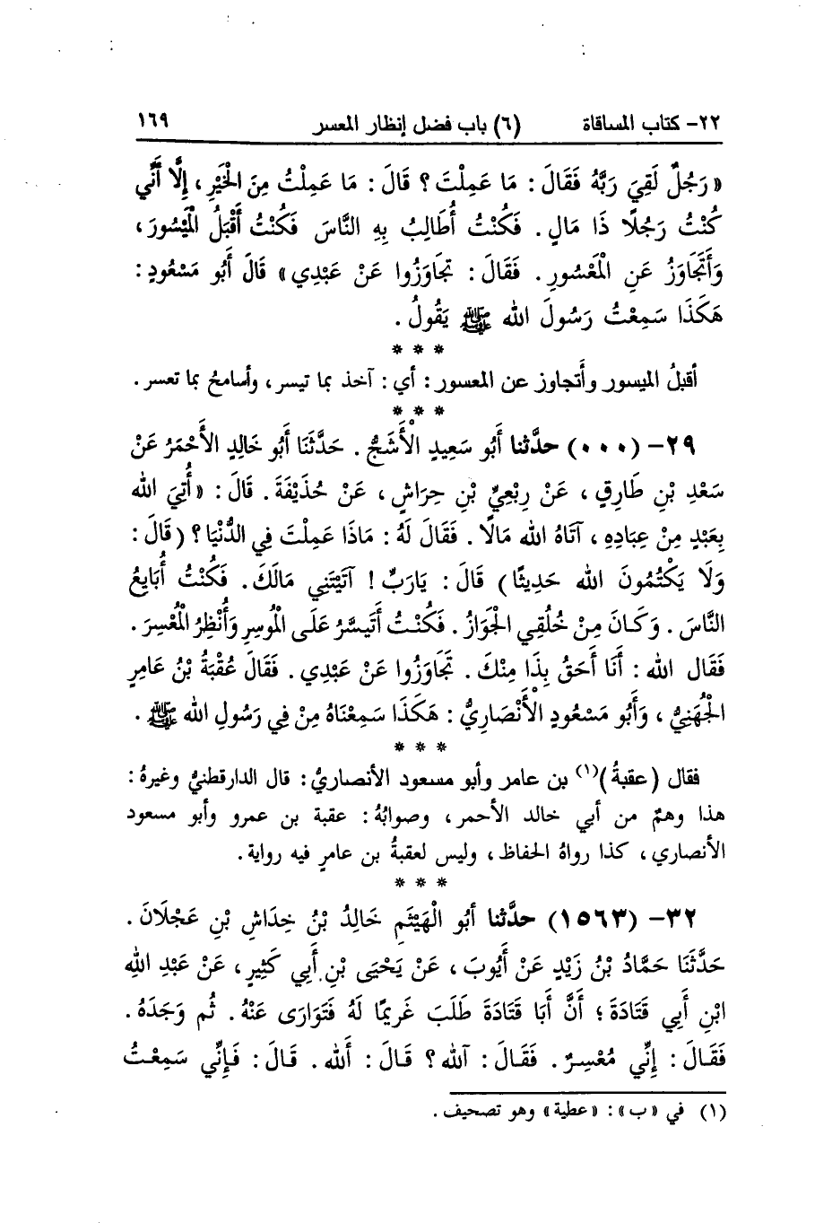 [1560] فتياني أَي غلماني ويتجوزوا أَي يسامحوا فِي الِاقْتِضَاء والاستيفاء وَقبُول مَا فِيهِ نقص يسير أقبل الميسور وأتجاوز عَن المعسور أَي آخذ بِمَا تيَسّر وأسامح بِمَا تعسر فَقَالَ عقبَة بن عَامر وَأَبُو مَسْعُود الْأنْصَارِيّ قَالَ الدَّارَقُطْنِيّ وَغَيره هَذَا وهم من أبي خَالِد الْأَحْمَر وَصَوَابه عقبَة بن عَمْرو وَأَبُو مَسْعُود الْأنْصَارِيّ كَذَا رَوَاهُ الْحفاظ وَلَيْسَ لعقبة بن عَامر فِيهِ رِوَايَة